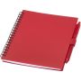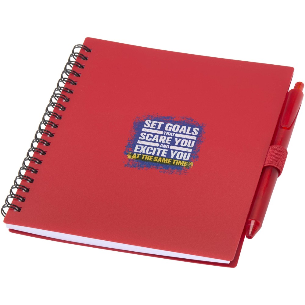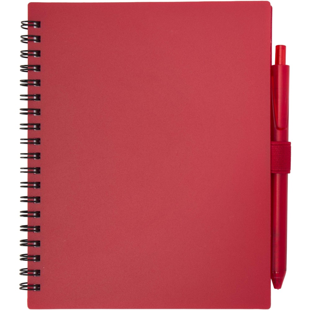 A Niove puhafedeles jegyzetfüzet újrahasznosított műanyagból készült, 70 darab, pontozott, 70 g/m2 papírlappal. A jegyzetfüzet sarkai lekerekítettek, és tolltartóhurokkal rendelkezik. Mérete: 140 × 178 mm. A golyóstoll szintén újrahasznosított műanyagból készült. Tollbetét színe: kék. Íráshossz: 1000 méter. Hegyméret: 1,0 mm.