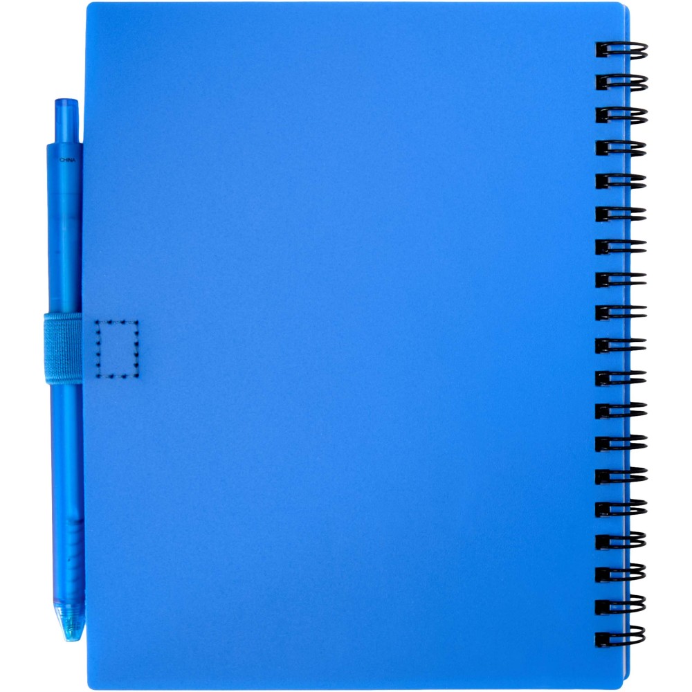 A Niove puhafedeles jegyzetfüzet újrahasznosított műanyagból készült, 70 darab, pontozott, 70 g/m2 papírlappal. A jegyzetfüzet sarkai lekerekítettek, és tolltartóhurokkal rendelkezik. Mérete: 140 × 178 mm. A golyóstoll szintén újrahasznosított műanyagból készült. Tollbetét színe: kék. Íráshossz: 1000 méter. Hegyméret: 1,0 mm.
