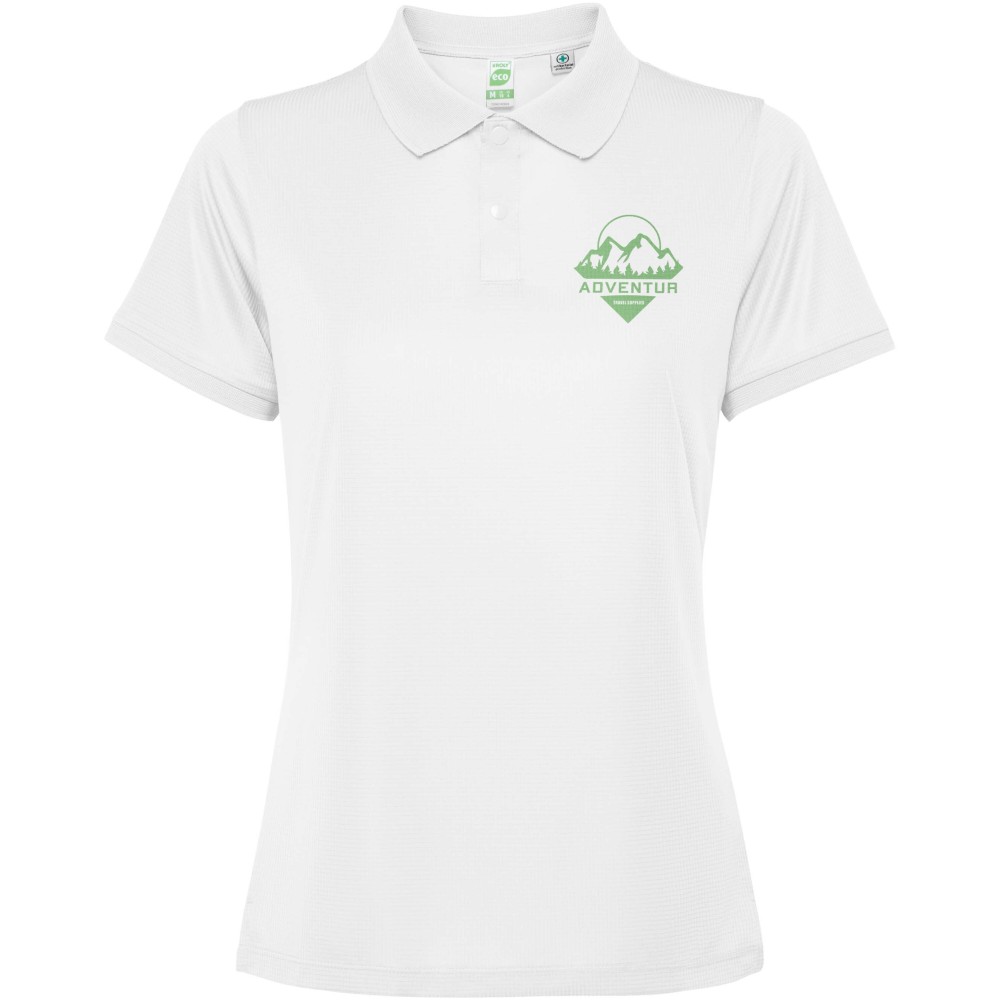 Rövidujjú galléros női póló. Erősített, fedett varrások a belső gallérban. 1x1 bordázott kézelő és gallér. Oldalsó varrások. 3 gombos nyakrész és oldalsliccek. 120g/m2.