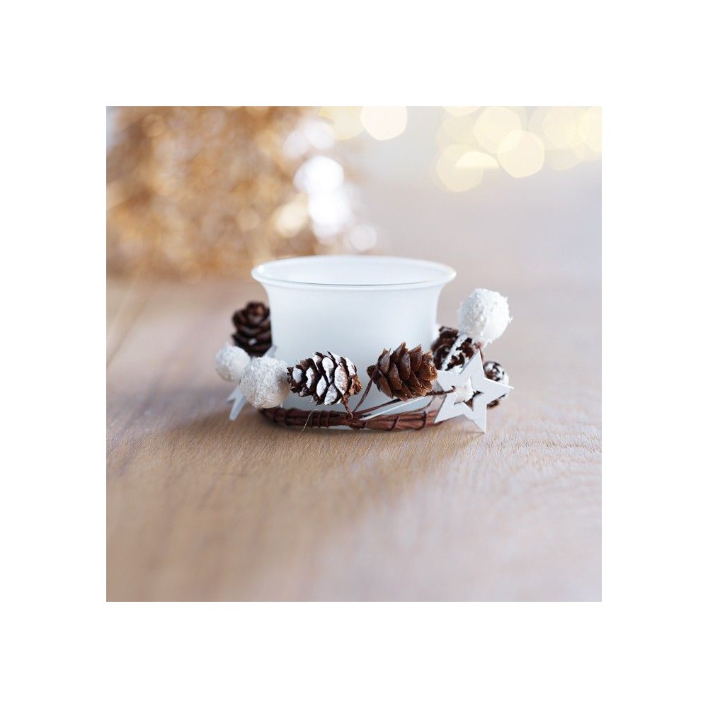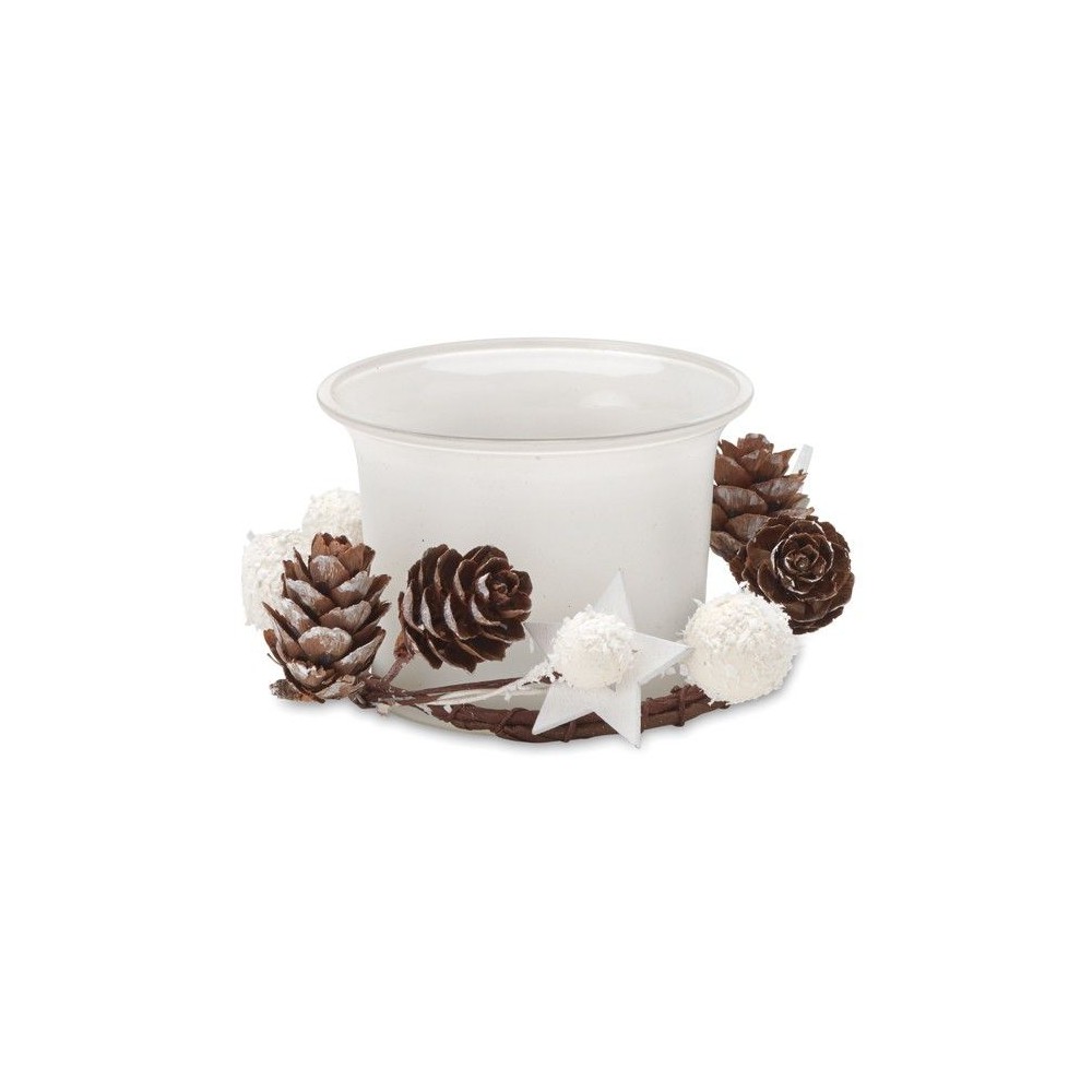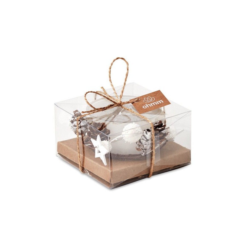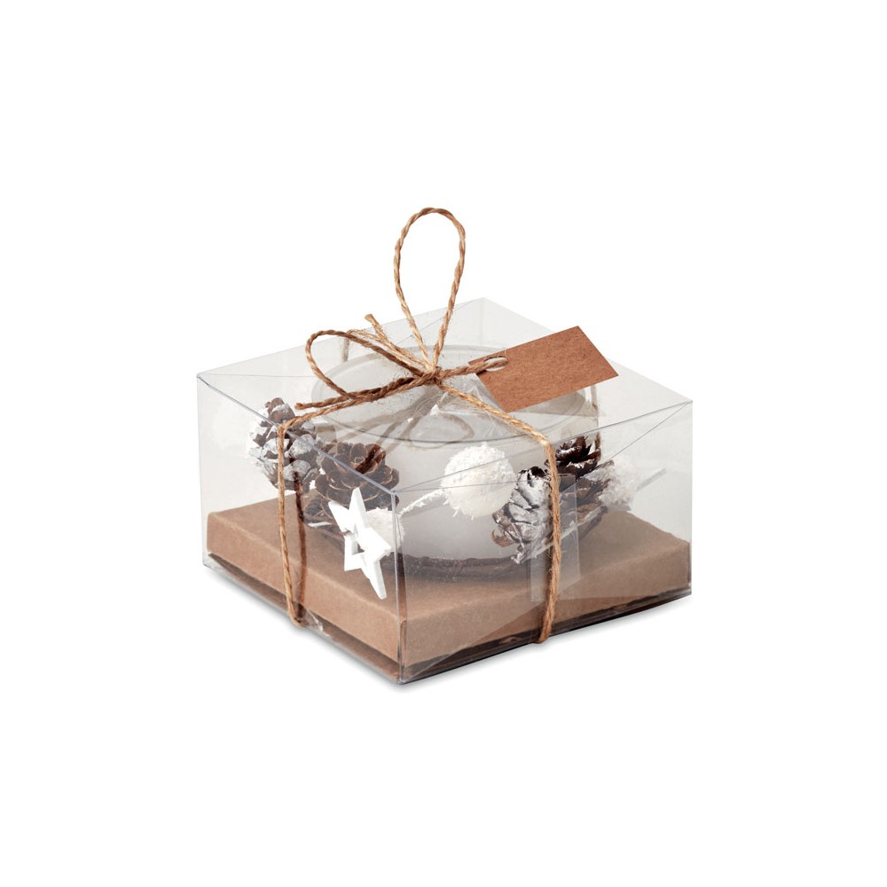 Díszekkel körbevett üveg mécsestartó. Karton és PVC ajándékdobozban, zsinórral átkötve, kis ajándékkísérő kártyával szállítjuk.