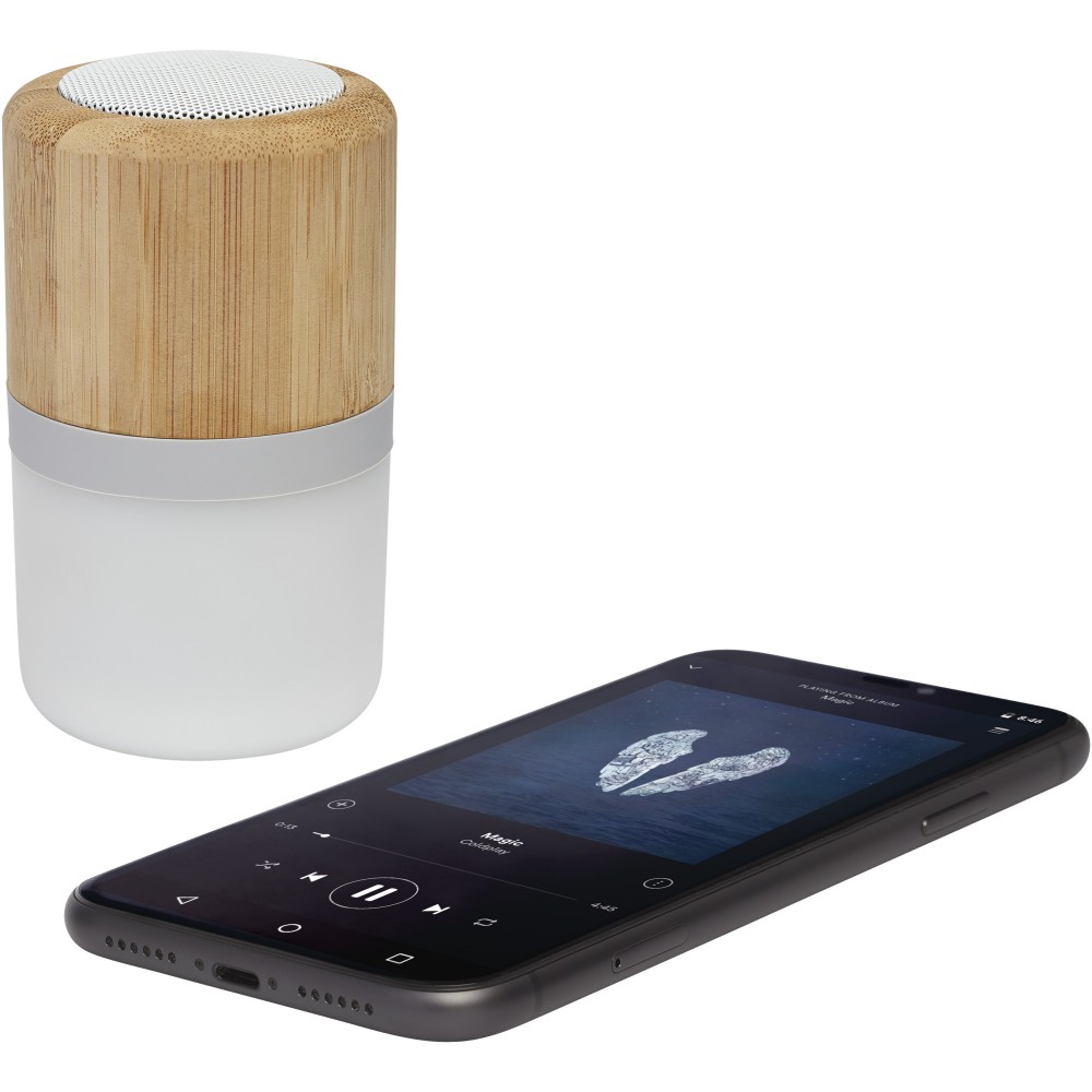 Bambusz Bluetooth 350 mAh hangszóró hangulatfénnyel. Akár 2 órás használat maximális hangerő mellett. Bluetooth 5.0 verzió. Hatótávolság akár 10 méter. Csomagolás Avenue díszdobozban és Micro-USB töltőkábellel. 70% bambusz és 30% ABS műanyag.