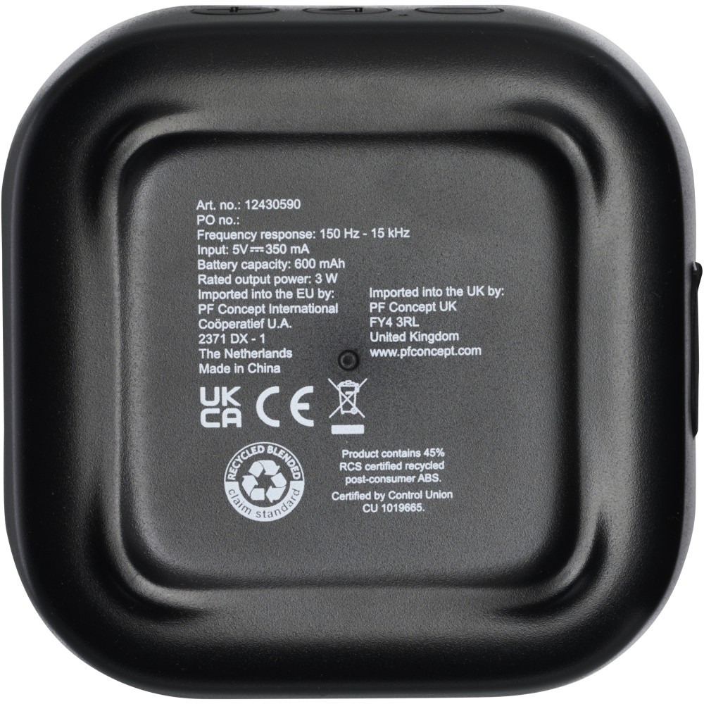 RCS újrahasznosított 3W-os Bluetooth hangszóró, amely zenét, podcastokat, stb. játszik le bármely Bluetooth kompatibilis eszközéről, így ideális társ minden alkalomhoz. A hangszóró beépített vezérlőkkel és mikrofonnal rendelkezik. Élvezze zenéit akár 3-4 órán keresztül maximális hangerőn. A töltési idő 3 óra. Bluetooth 5.3 körülbelül 10 méteres működési hatótávolsággal. Használati útmutatóval, 30 cm-es USB-A-C típusú töltőkábellel és fenntartható forrásból származó, 100%-ban újrahasznosított kartondobozba csomagolva szállítjuk. Újrahasznosított ABS műanyag. Csomagolás: FSC Recycled 100% P5.1 CU-COC-877277.