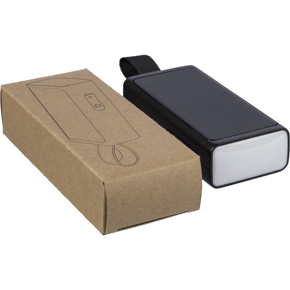 Újrahasznosított ABS-ből készült 5W teljesítményű hangszóró COB LED zseblámpával, szilikon hurokkal és 5.4-es vezeték nélküli technológiával. 500 mAh kapacitású akkumulátorral rendelkezik, 5V/500 mA bemenettel. Kültéri kialakítású, a terméktesten recycled (újrahasznosított) alapanyagra utaló logó található. Barna dobozba csomagolva.