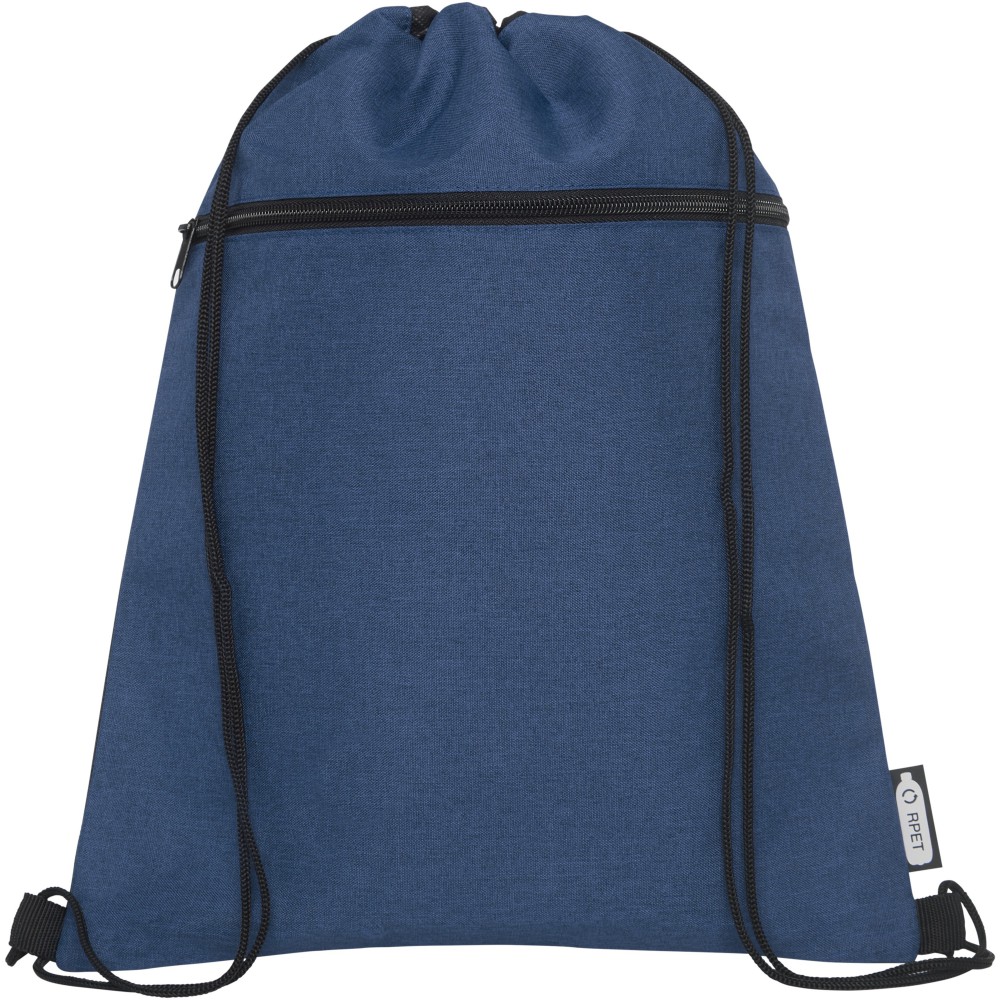 Tornazsák újrahasznosított RPET anyagból, fekete húzózsinórral, cipzáros zsebbel. Teherbírás 5 kg-ig. A termék színében kisebb eltérések lehetnek a festés, a szövés és a nyomtatás jellege miatt. 300D of újrahasznosított PET műanyag, újrahasznosított nemszőtt polipropilén, 80 g/m2.