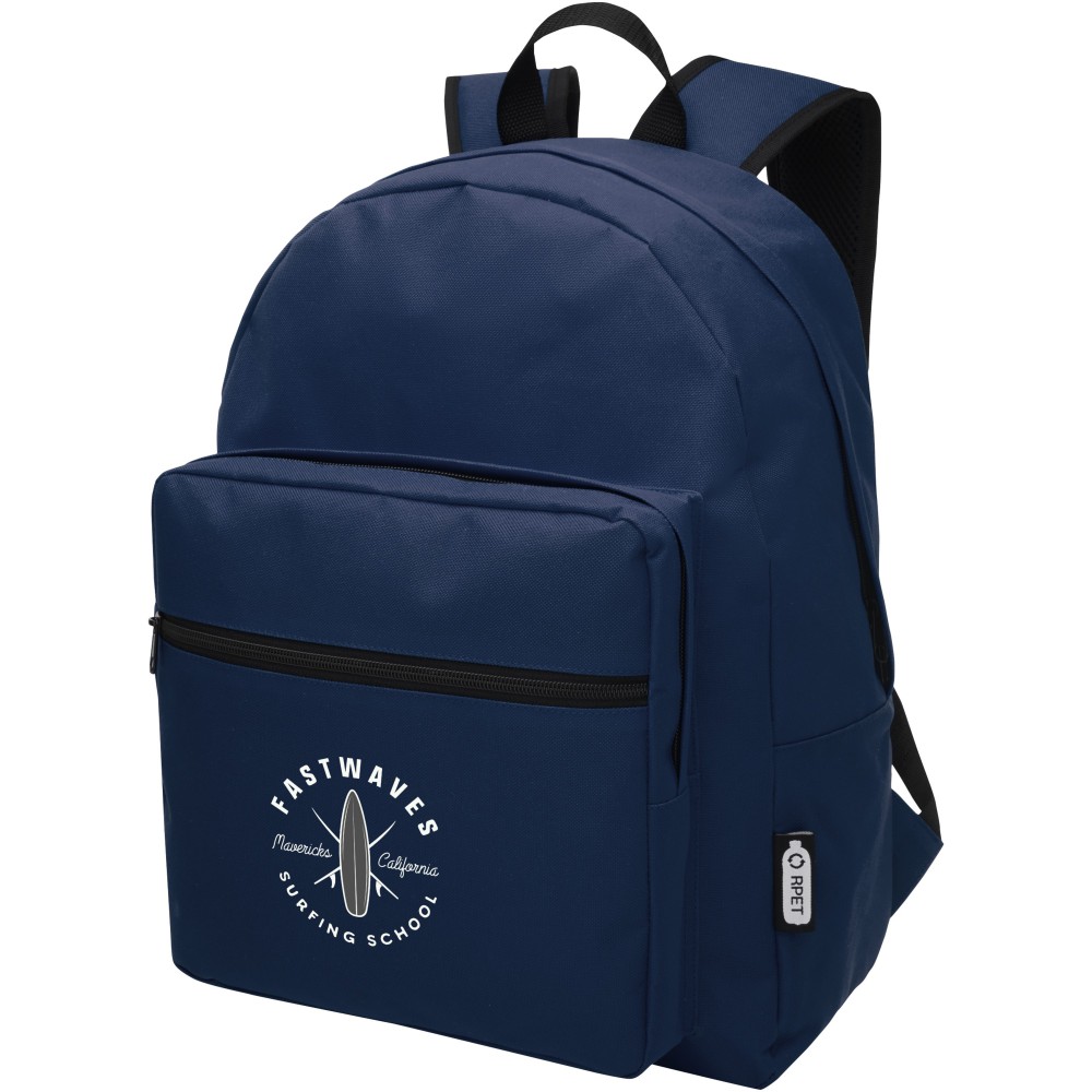 Hátizsák 100%-ban újrahasznosított műanyagból készült, amivel hozzájárulunk a műanyag hulladék csökkentéséhez. Állítható vállpántok, 2 cipzáras rekesz és egy első cipzáras zseb. Körülbelül 15 palack újrahasznosításából gyártott termék. RPET.
