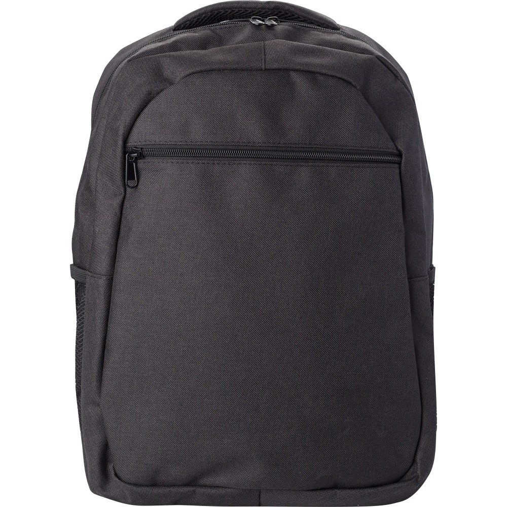 Hátizsák cipzáras elsőzsebbel és állítható vállpántokkal. Belső zseb laptop számára 15 -ig. 2 oldalon hálós zseb. 600D poliészter.