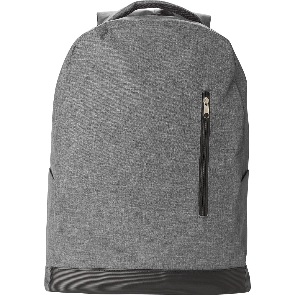 600D RPET poliészter lopásgátló hátizsák hátul gurulós bőröndre húzható pánttal. Elöl egy kis cipzáros zseb. Mindkét oldalán palacktartó zseb. Belül egy nagy rekesz tépőzáras laptop zsebbel. Alkalmas nagyméretű laptopokhoz. Állítható vállpántok. Alul egy kis bélelt rész újrahasznosított autógumiból.