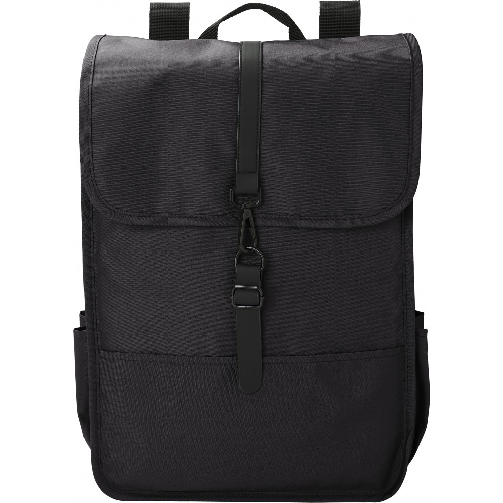 Hátizsák. Két palackzseb az oldalán, egy nagy rekesz. Fekete PU pánttal, csattal zárható. 300D RPET poliészter.