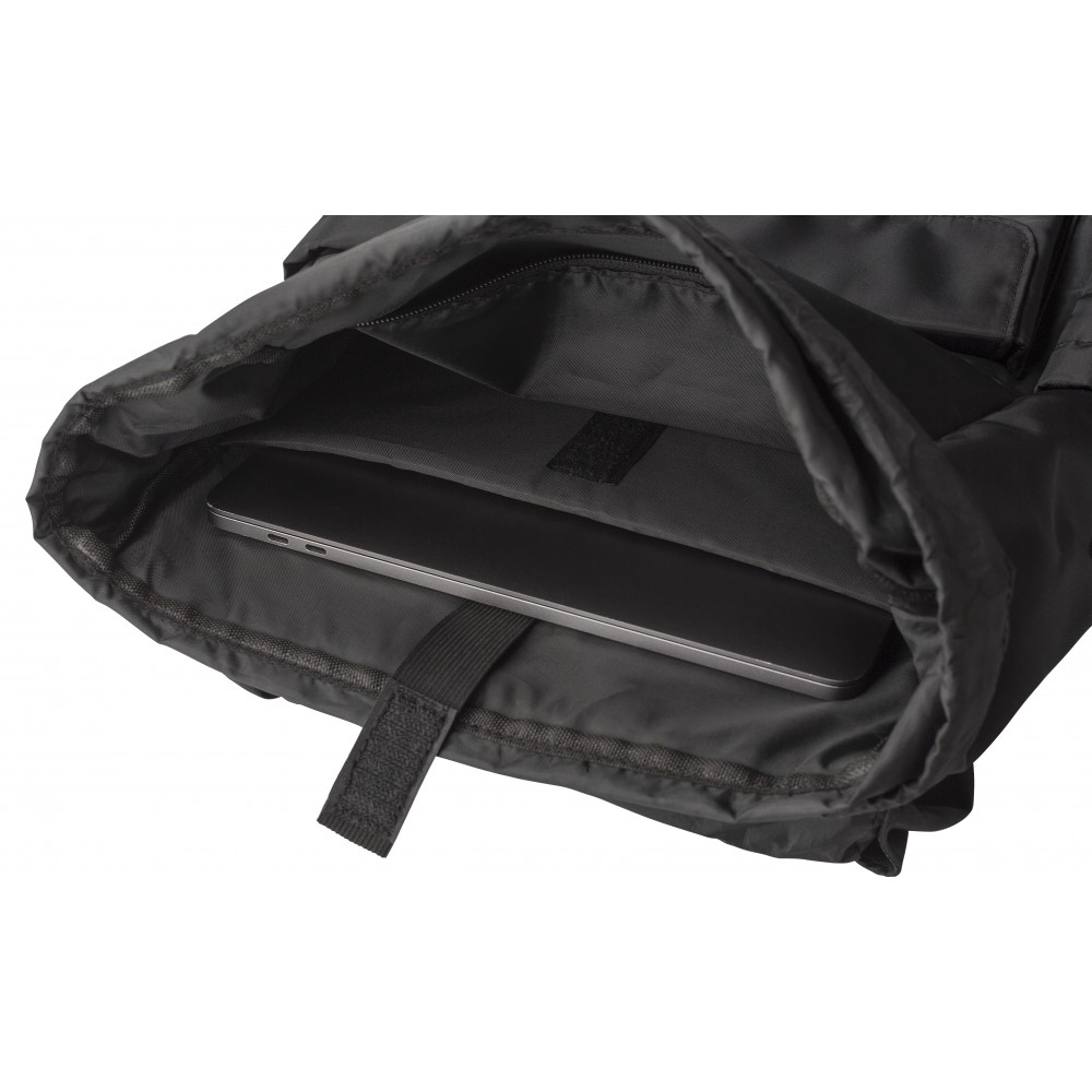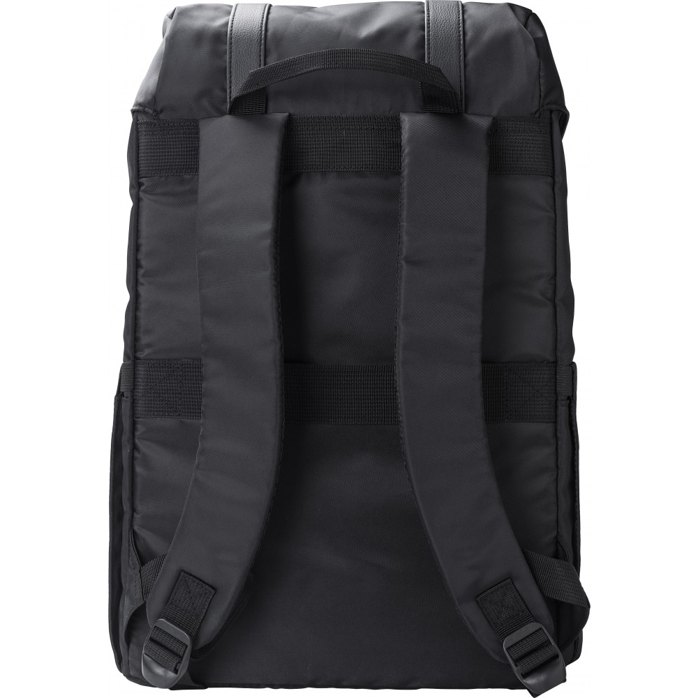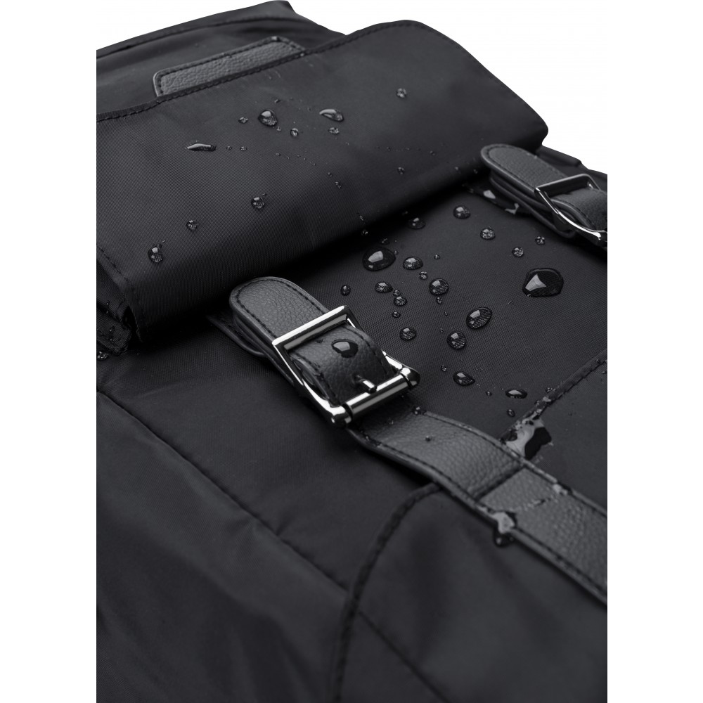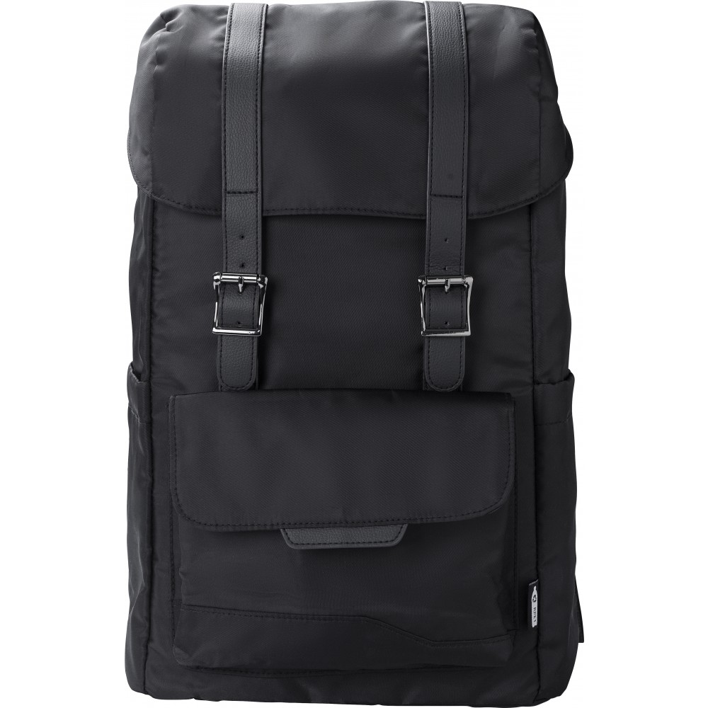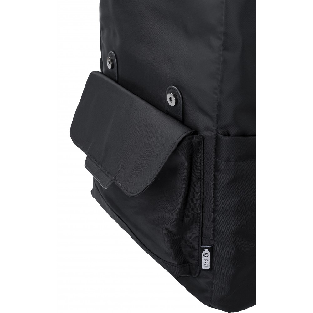 Hátizsák. Oldalt palacktartók, elöl mágneses záródású zseb. A belső zseb zsinórral zárható, belül laptoptartó és normál zseb található (15 -es laptop számára). A hátoldalon pánt található a bőrönd húzókájára való rögzítés érdekében. Vízlepergető bevonat. 290T twill poliészter RPET.