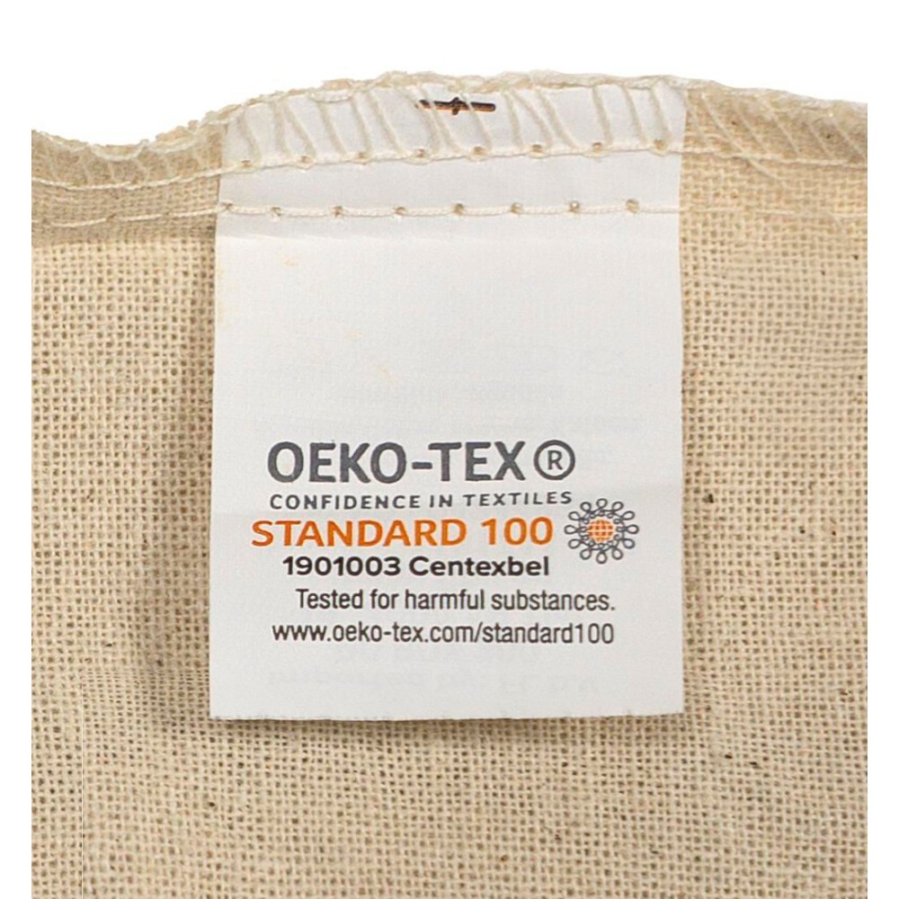 Tornazsák. Festett pamut. Maximális teherbírás: kb. 8 kg. Oeko-Tex címkével. Oeko-Tex pamut 150 g/m2.