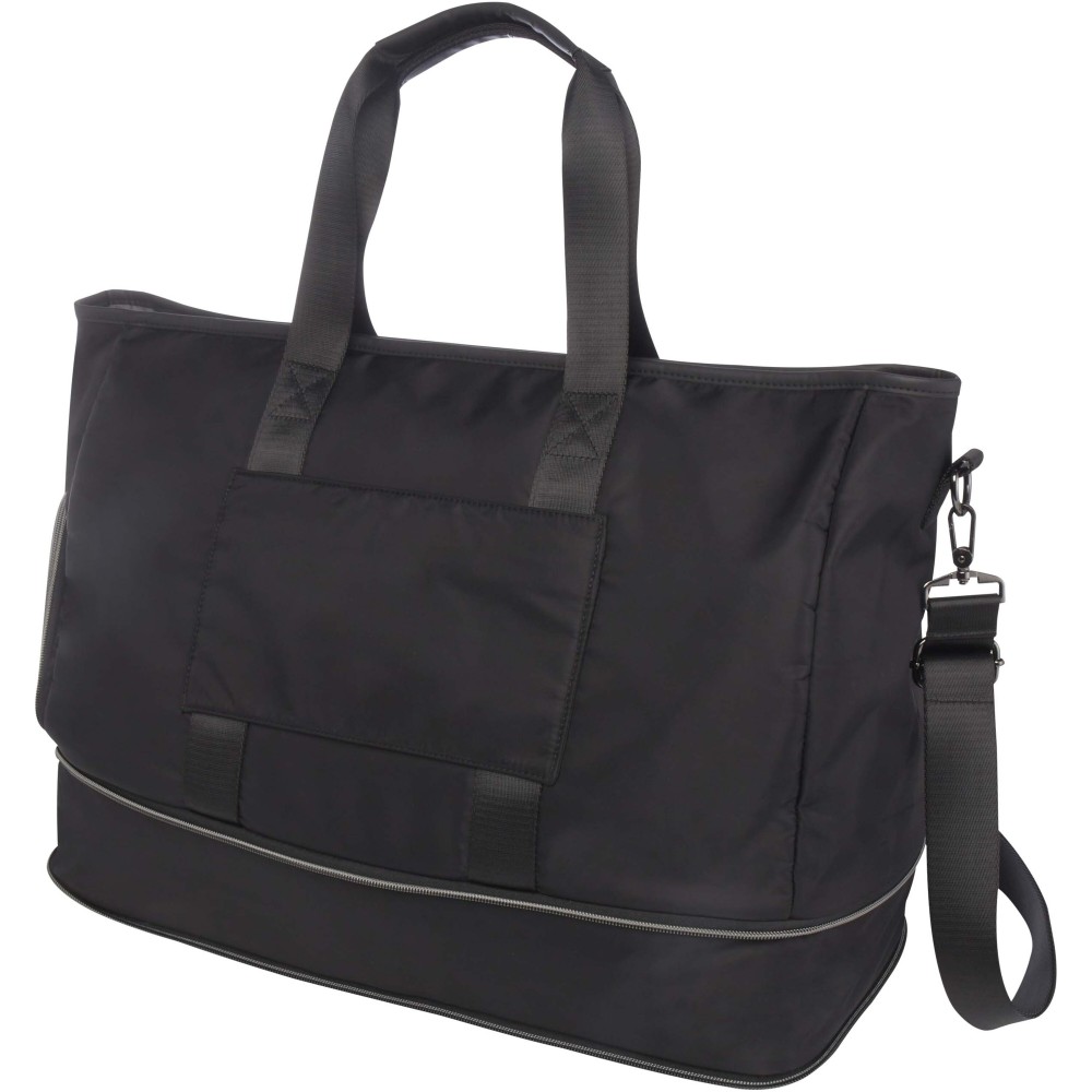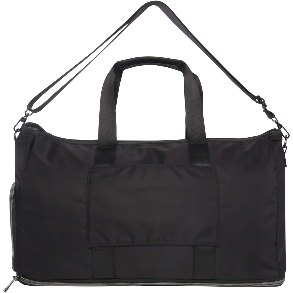A Rhine bővíthető sporttáska stílusos kialakításával és sokoldalúságával tökéletes választás különféle alkalmakra. Kiváló minőségű, GRS tanúsítvánnyal rendelkező újrahasznosított nejlonból készült, puha RPET béléssel és prémium PU bőr elemekkel. A táska tágas főrekesszel rendelkezik, amely egy nagy, szivárgásmentes TPU zsebet, két nyitott zsebet és egy dedikált cipőtartó rekeszt tartalmaz. A hátoldalon található egy biztonságos rejtett zseb, amely egyben bőröndpántként is funkcionál. Az állítható, levehető vállpánt maximális kényelmet biztosít. A táska különlegessége a bővíthető réteg, amely akár 42 literes kapacitásra növelhető. Alap kapacitása 35 liter, maximális terhelhetősége 20 kg. PVC-mentes.