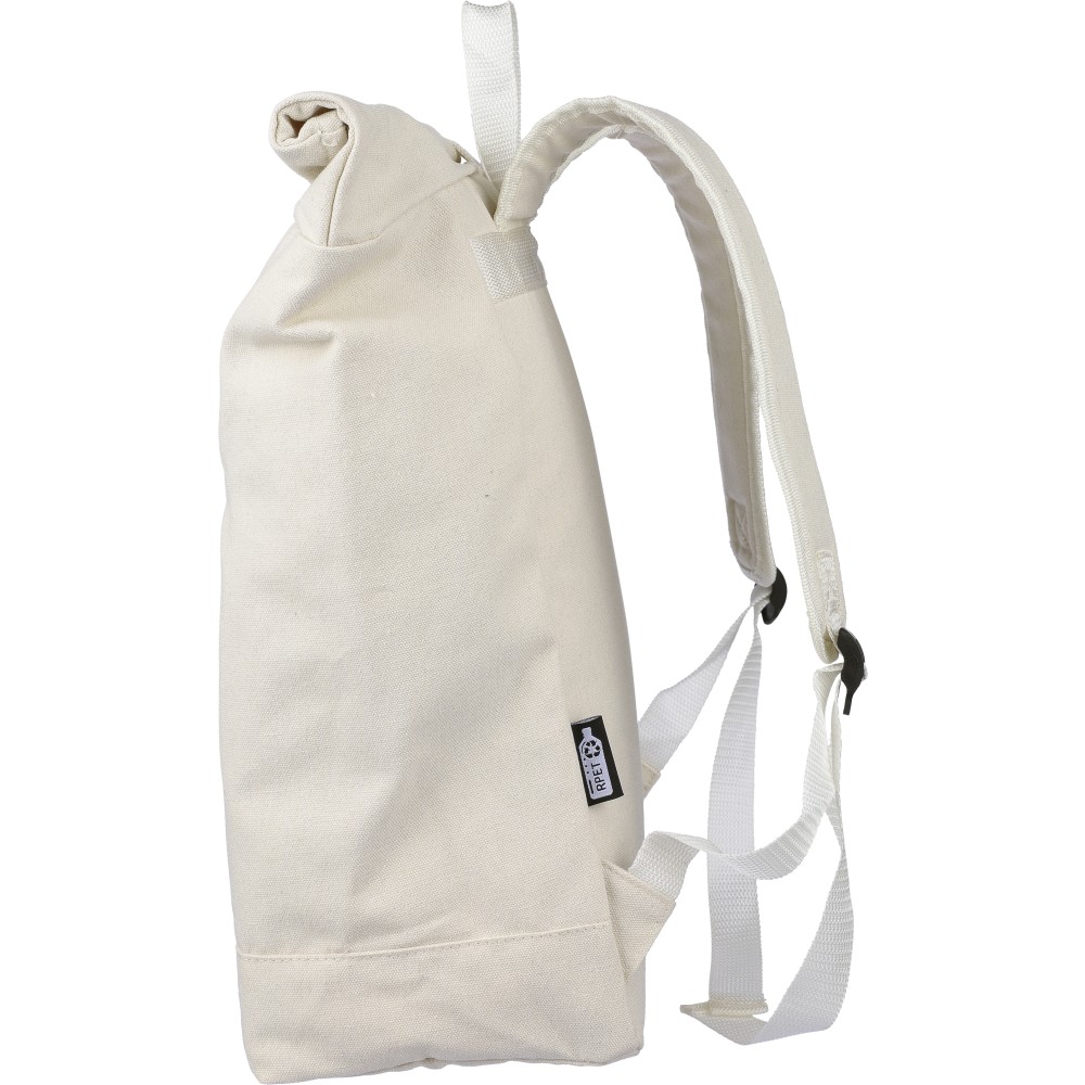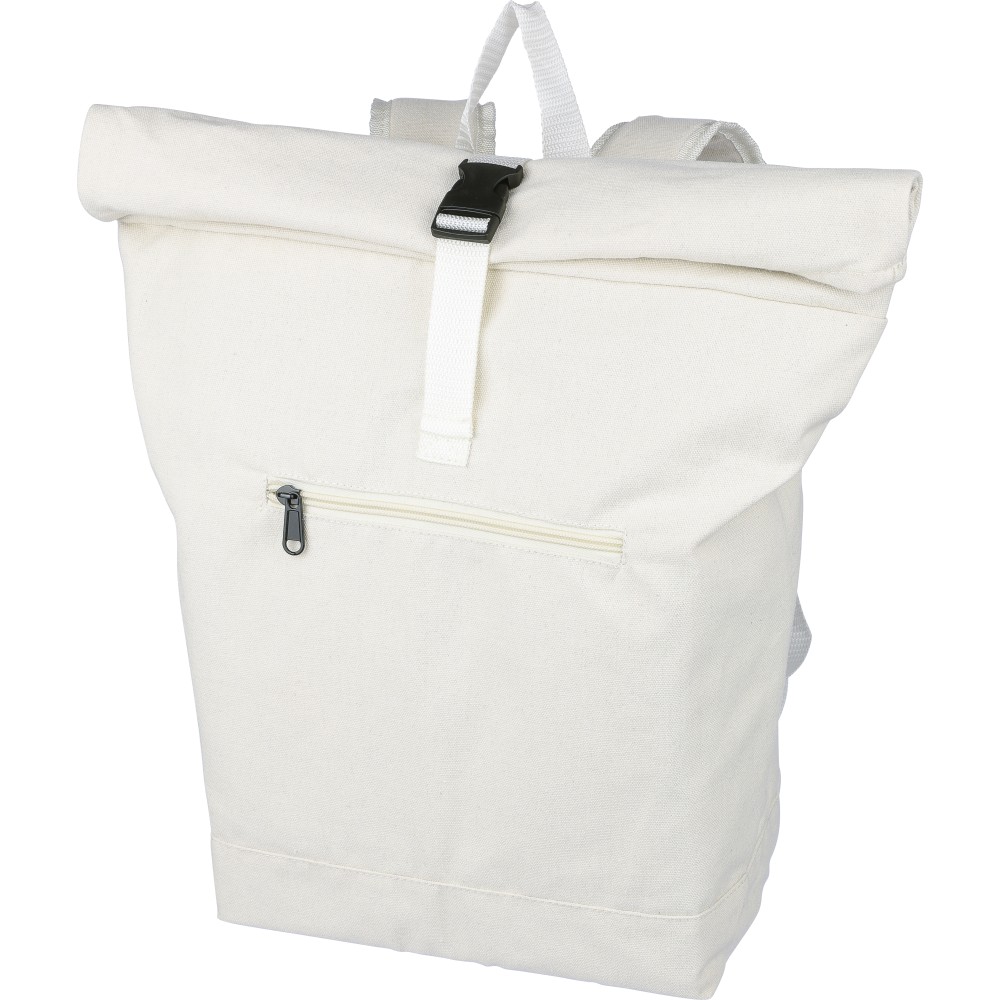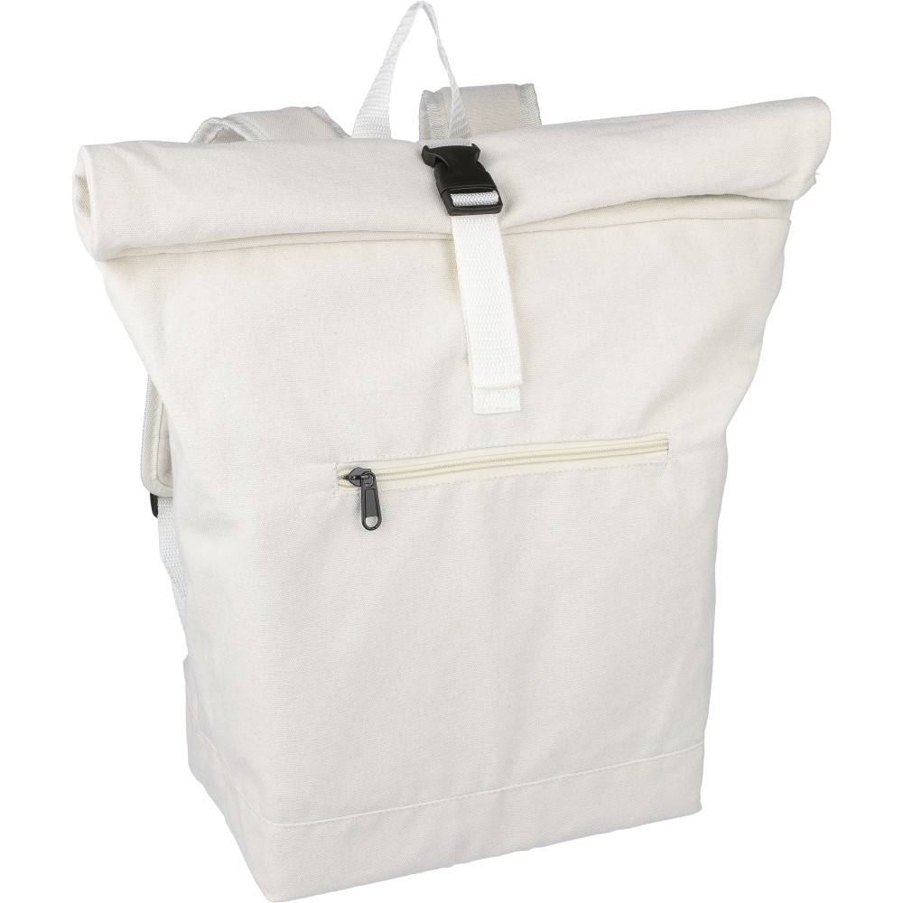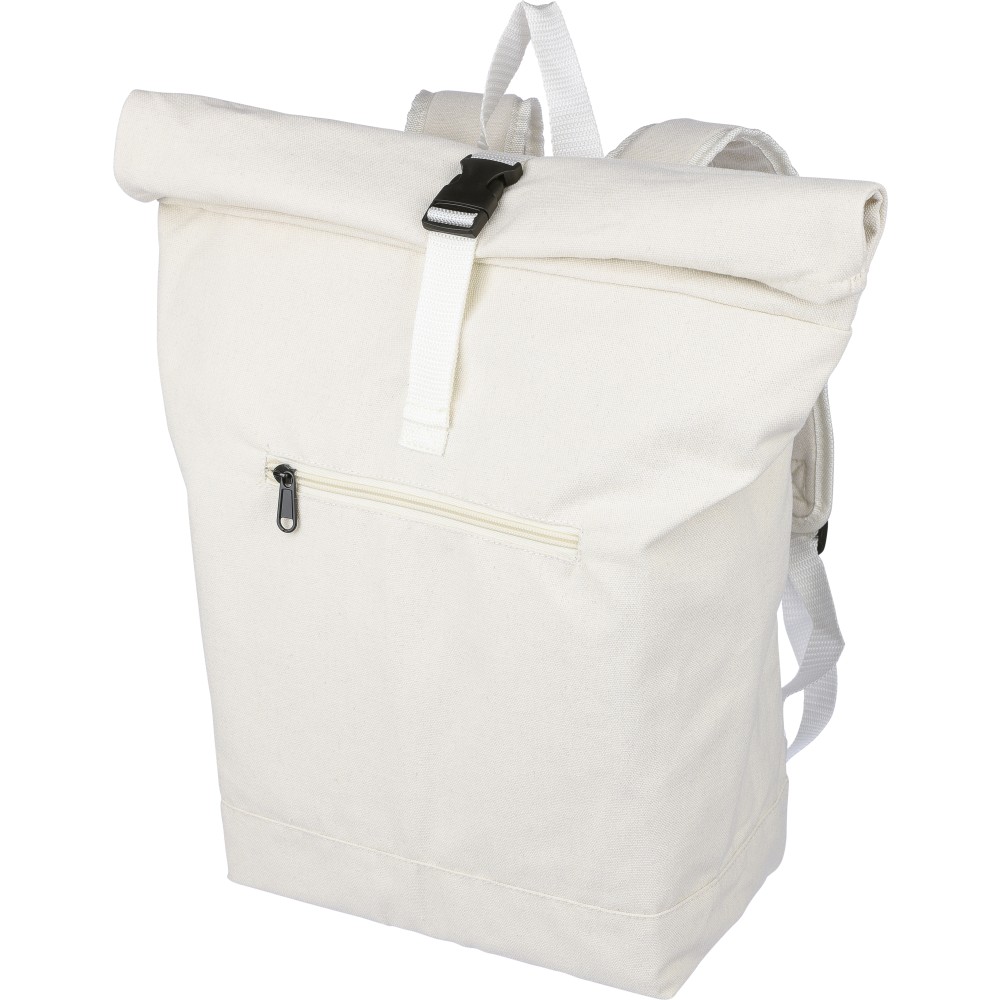 Rolltop hátizsák 330 g/m2 újahasznosított policotton anyagból, 210D poliészter béléssel és műanyag csattal. 15 literes űrtartalommal, egy nagy cipzáras rekesszel, 15 -es laptoptartó résszel, két belső és egy külső rekesszel. Tetején hordozófüllel, párnázott, állítható vállpánttal és egy kicsi, cipzáras elsőzsebbel. Teherbíró képessége 14 kg. Címkét tartalmaz.