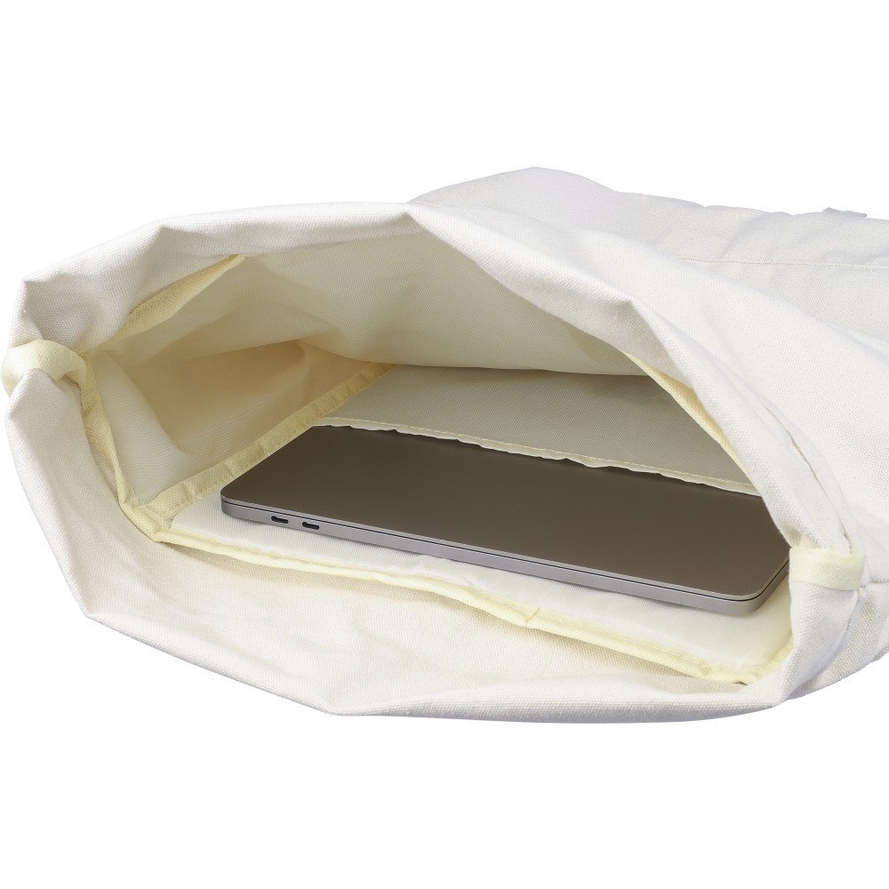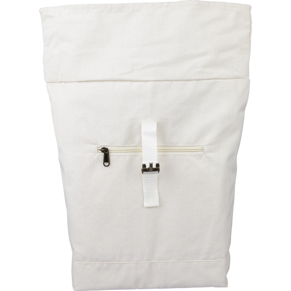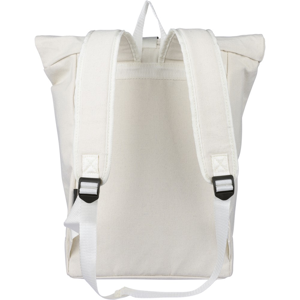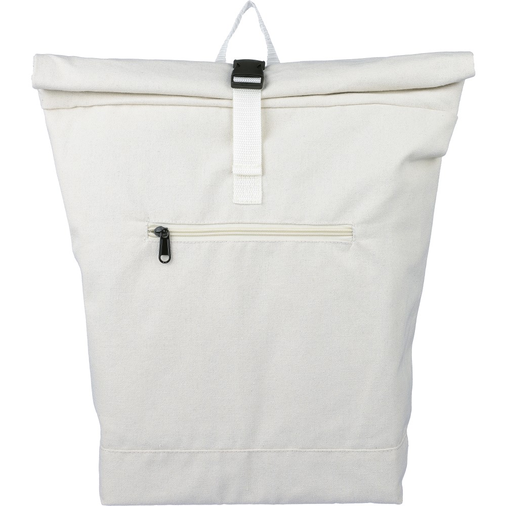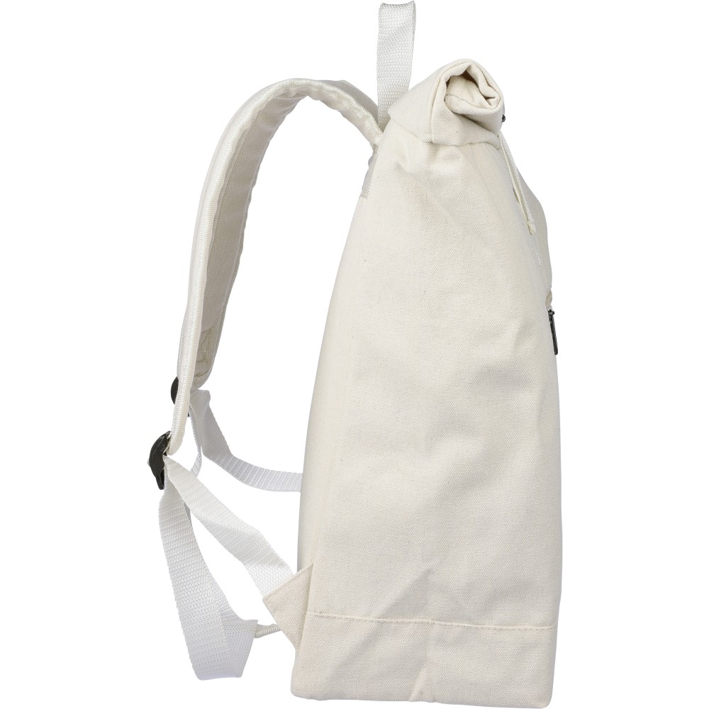 Rolltop hátizsák 330 g/m2 újahasznosított policotton anyagból, 210D poliészter béléssel és műanyag csattal. 15 literes űrtartalommal, egy nagy cipzáras rekesszel, 15 -es laptoptartó résszel, két belső és egy külső rekesszel. Tetején hordozófüllel, párnázott, állítható vállpánttal és egy kicsi, cipzáras elsőzsebbel. Teherbíró képessége 14 kg. Címkét tartalmaz.
