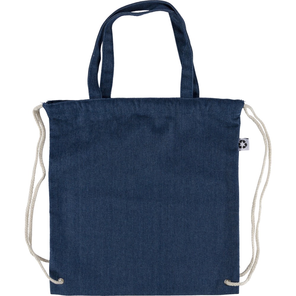 Újrahasznosított farmeranyagból készült húzózsinóros táska 40 × 38 cm méretben, 2,5 × 50 cm hosszúságú fülekkel és húzózsinóros záródással. A külső felületen újrahasznosított alapanyagra utaló címke található, vállpántként vagy kézi hurokként is hordható.