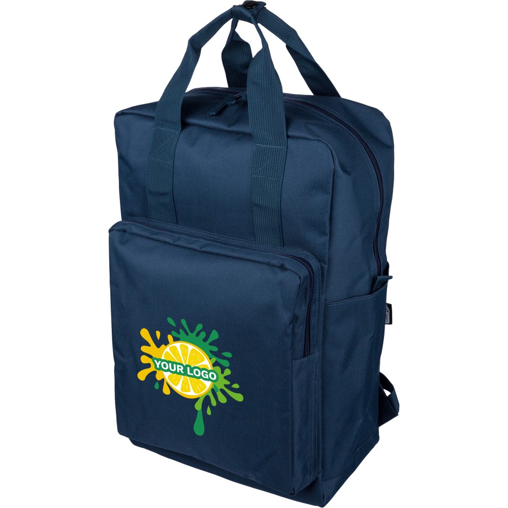 Újrahasznosított 900D poliészterből készült hátizsák, 210D béléssel és rPET címkével. Tágas fő rekesszel rendelkezik, 16?-os laptop számára kialakított külön zsebbel, elülső rekesszel, két oldalzsebbel, valamint bőröndre rögzíthető pánttal (trolley strap). Felső fogantyúi gombbal összefoghatóak, vállpántjai szellőző kialakításúak a kényelmes viselet érdekében.