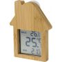Ház alakú bambusz időjárásjelző állomás. Tapadókoronggal a hátoldalon. Funkciók: aktuális hőmérséklet, minimum hőmérséklet és maximum hőmérséklet. Elemeket tartalmaz. Egyenként csomagolva barna kartondobozban.