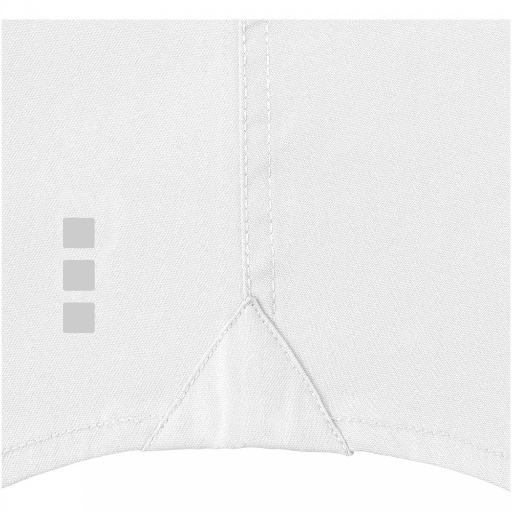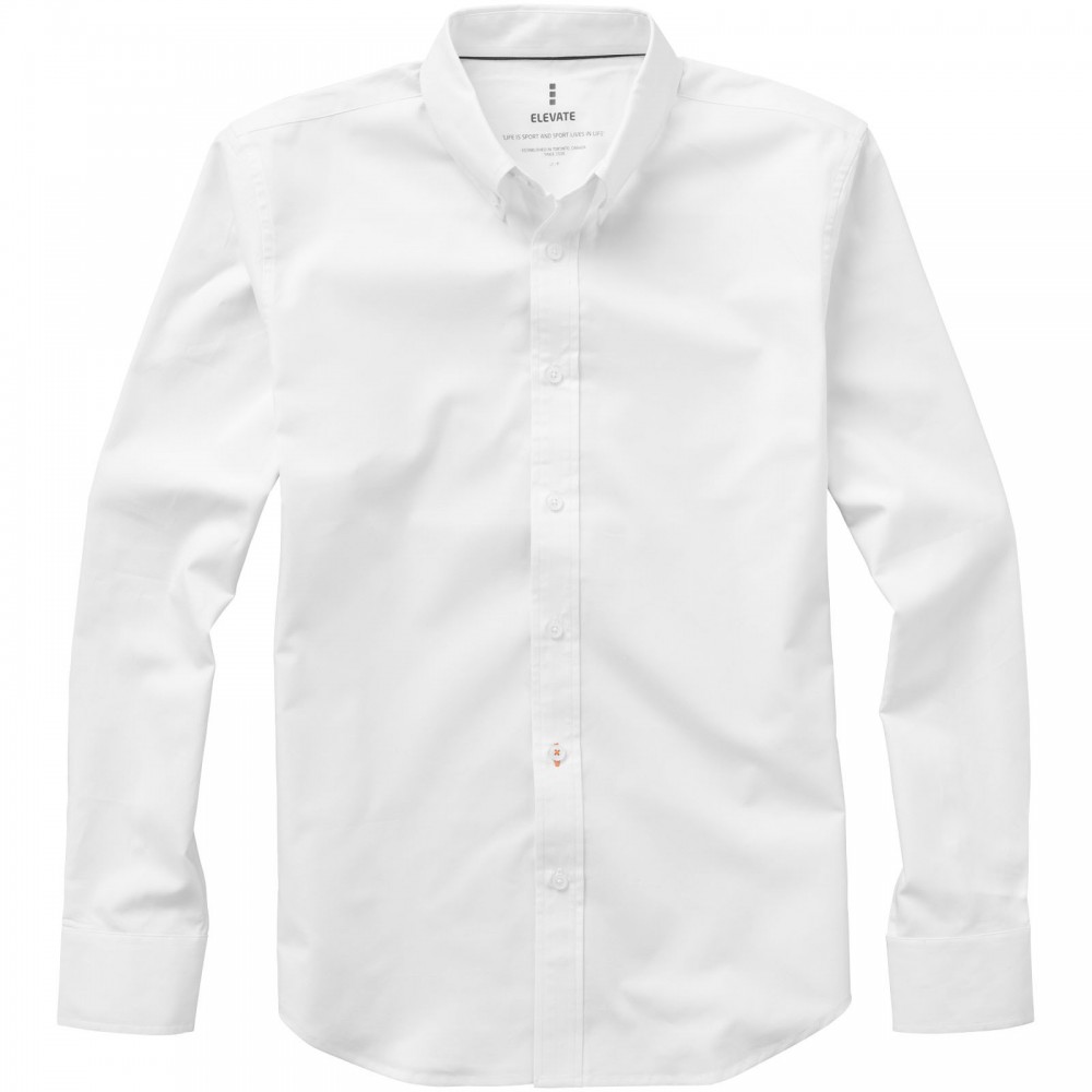 Normál szabásvonal. Elevate logóval gravírozott, fehér gombok. Alulról a második gomblyuk narancssárga öltésekkel dekorálva. Két gombos, állítható kézelő gombolás. Tónusos logónyomat hátul. Szatén szegély a nyakvonalban. Legombolható gallér (férfi). 100% pamut Oxford anyag. 142 g/m2.