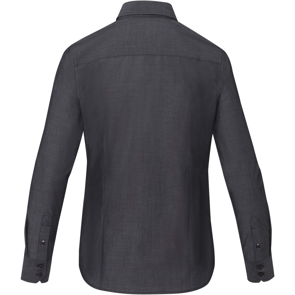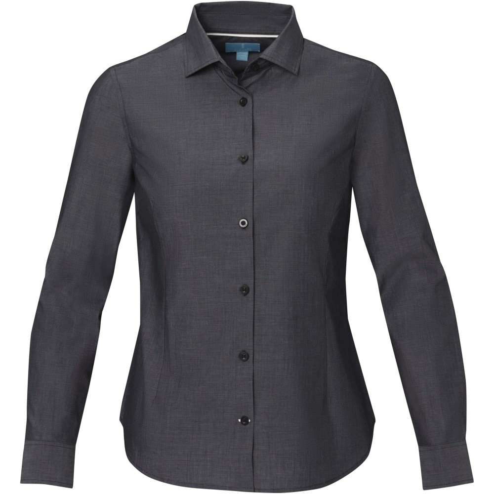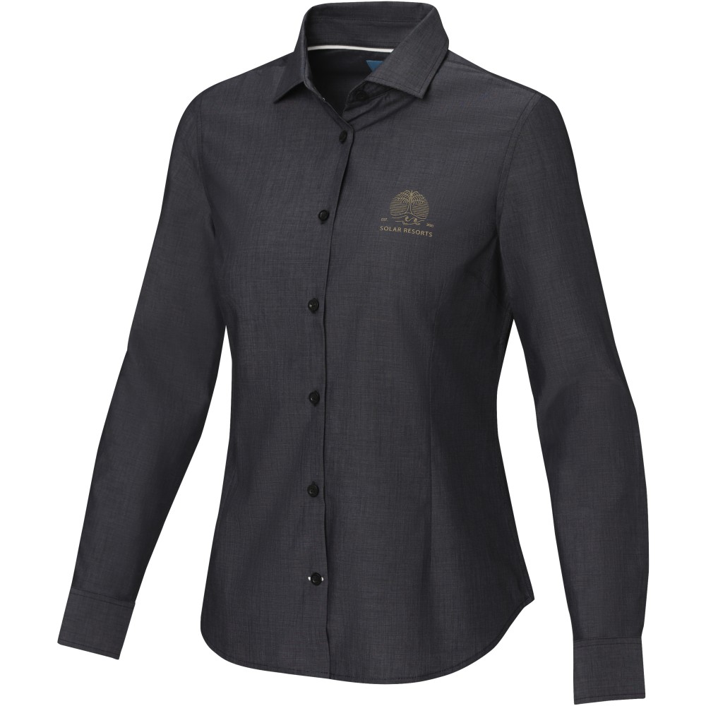 Női hosszúujjú blúz. Fenntartható promóciós ruházat. Gravírozott gyöngyházfényű gombok. Állítható mandzsetta egy hajtással. Szatén szegés a belső nyakon. Kontrasztos színű varrások az ujjakon és az alsó gomblyukon. Szőtt címke. Poplin 100% minősített biopamutból, 121 g/m2.