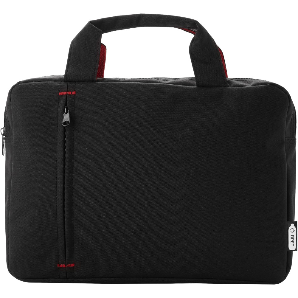Újrahasznosított PET műanyagból készült konferenciatáska cipzáras fő rekesszel és elülső cipzáras zsebbel, megerősített felső fogantyúkkal és divatos színű kontrasztelemekkel.