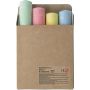 Aszfaltkréta négy színnel: zöld, kék, sárga és rózsaszín. Csomagolása barna doboz.