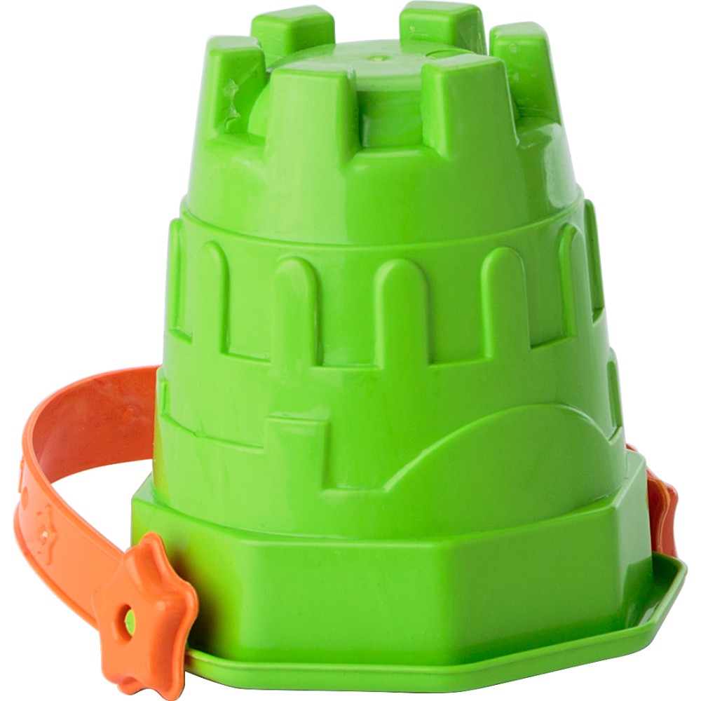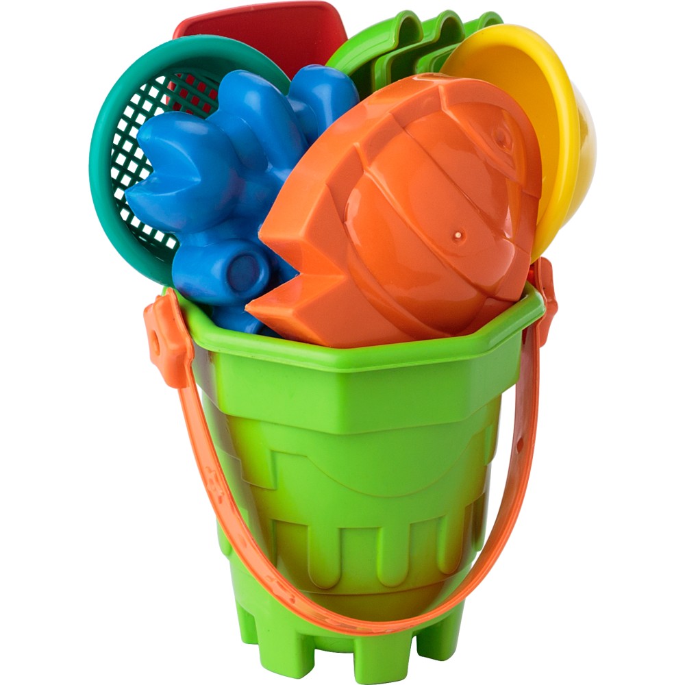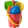 Újrahasznosított PP homokozóvödör (4 színben vegyesen). Minden vödör tartalmaz lapátot, gereblyét, kanalat, szitát és két homokozóformát. Egyenként hálóba csomagolva, kartonkártyával együtt érkezik.