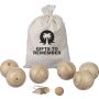 Fa labdajáték készlet 6 db, egyenként 7 cm átmérőjű labdával, egy kisebb, 2 cm-es golyóval és mérőzsinórral. Vászontasakba csomagolva. 4-6 játékos számára.