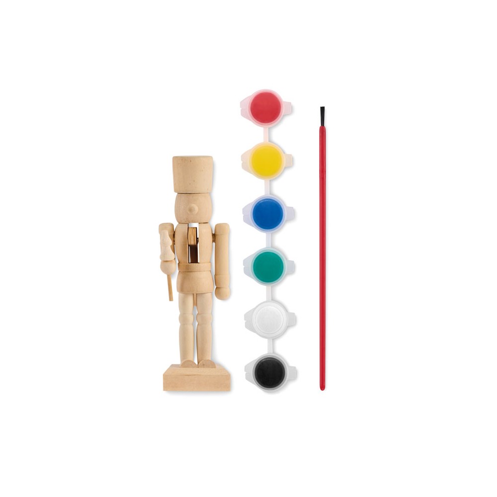 Kifestő készlet fa diótörő figurával, 6 színes vízbázisú festékkel és 1 ecsettel.
