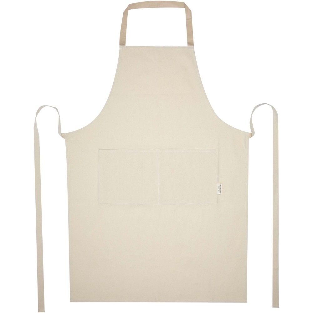 A Nia kötény 100% GRS tanúsítvánnyal rendelkező, 200 g/m2 újrahasznosított pamutból készült. Természetes pamut színe és kontrasztos nyakkpántja elegánsan védi ruhádat főzés közben. Két egymás melletti zsebbel rendelkezik, összesen 45 x 20 cm-es mérettel, és 1 méter hosszú pánttal rögzíthető hátul.