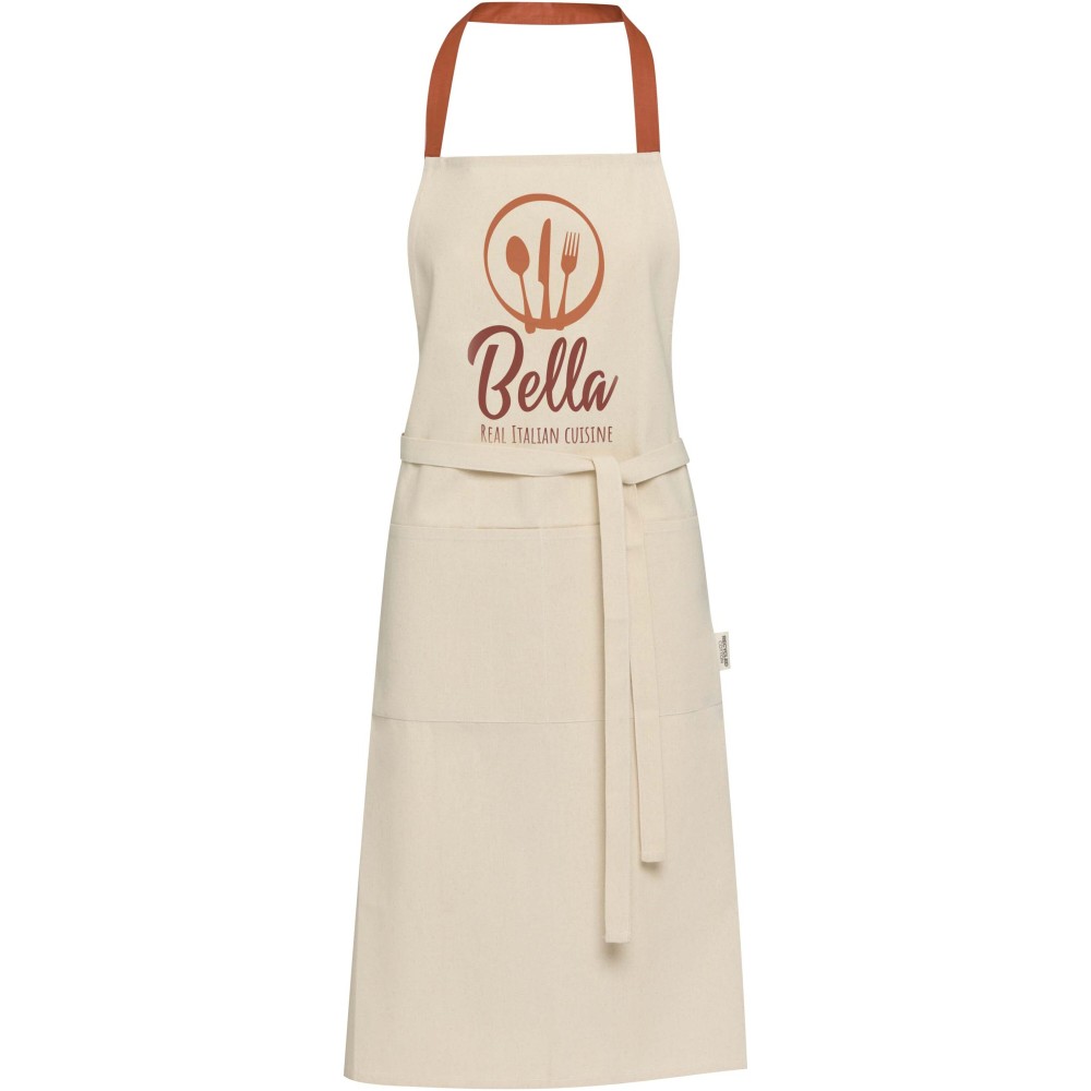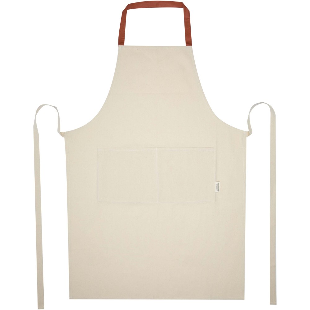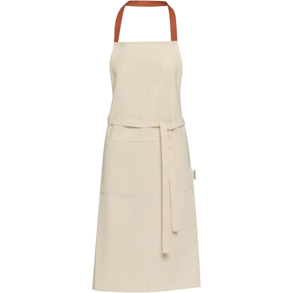 A Nia kötény 100% GRS tanúsítvánnyal rendelkező, 200 g/m2 újrahasznosított pamutból készült. Természetes pamut színe és kontrasztos nyakkpántja elegánsan védi ruhádat főzés közben. Két egymás melletti zsebbel rendelkezik, összesen 45 x 20 cm-es mérettel, és 1 méter hosszú pánttal rögzíthető hátul.