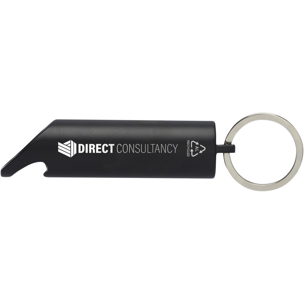 LED zseblámpa üvegnyitóval, be-/kikapcsoló gombbal és fém kulcskarikával. Könnyű és erős, 63%-os RCS tanúsítvánnyal rendelkező újrahasznosított alumíniumból készült. A Recycled Claim Standard (RCS) a termék újrahasznosított tartalmát a teljes ellátási láncban ellenőrzi. Különféle feltűnő színekben, fémes bevonattal kapható. Három LR44 elemmel szállítjuk. Újrahasznosított alumínium.