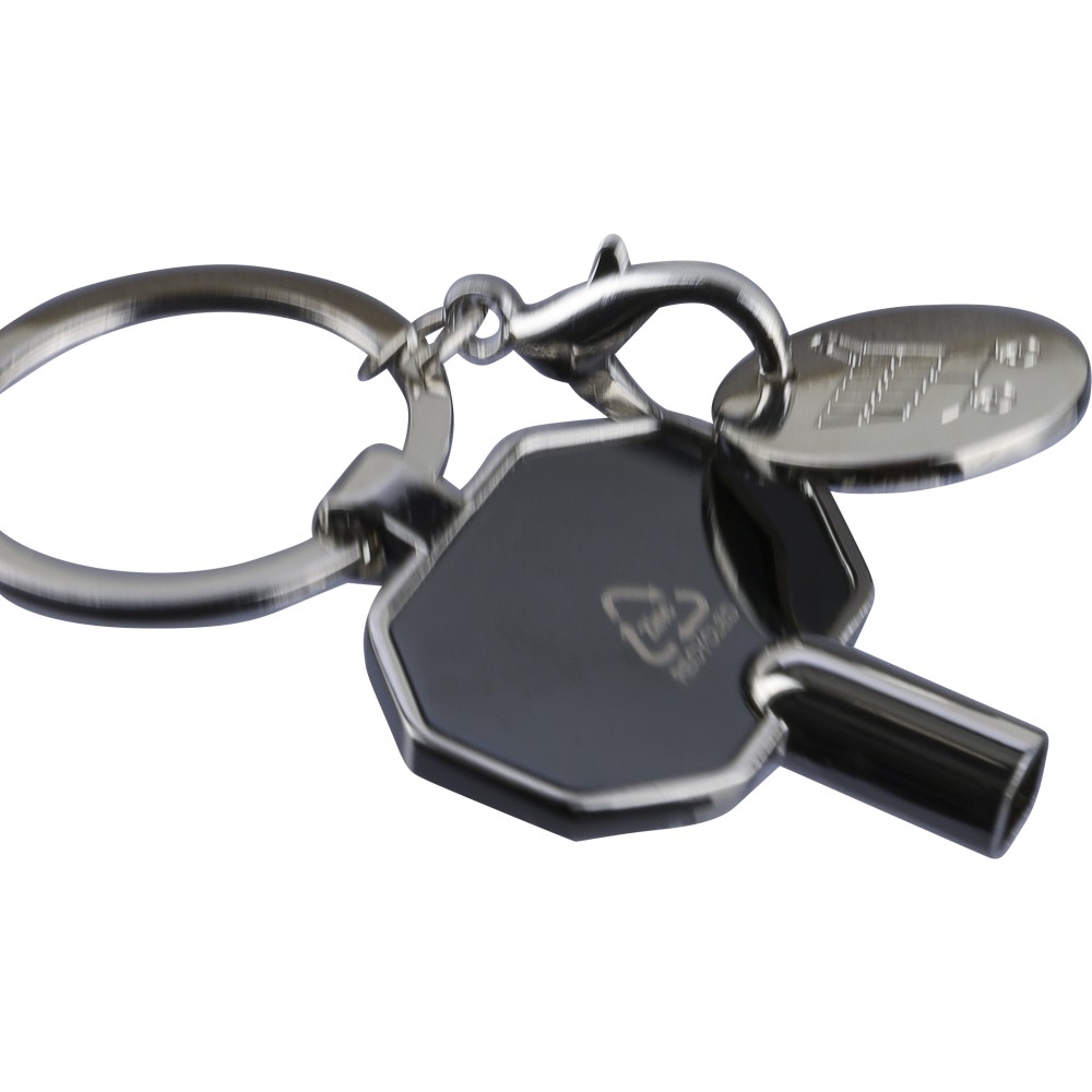 Újrahasznosított cinkötvözetből készült radiátor-légtelenítő kulcstartó bevásárlóérmével. 5×5 mm-es négyszögkulccsal rendelkezik, amely európai szabvány a radiátorok légtelenítéséhez. Erős fém kulcskarikával ellátva, a terméken recycled (újrahasznosított) alapanyagra utaló logó található. Illusztrációval ellátott barna karton borítékban csomagolva.