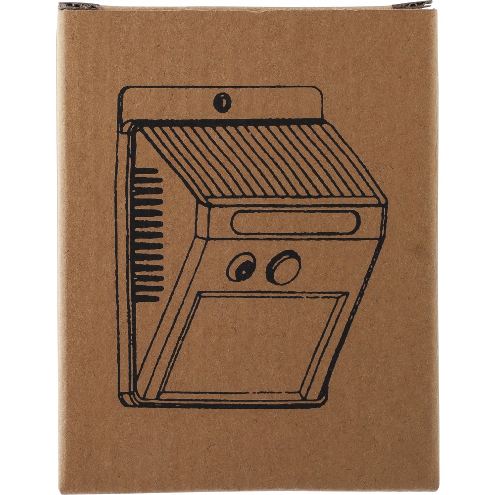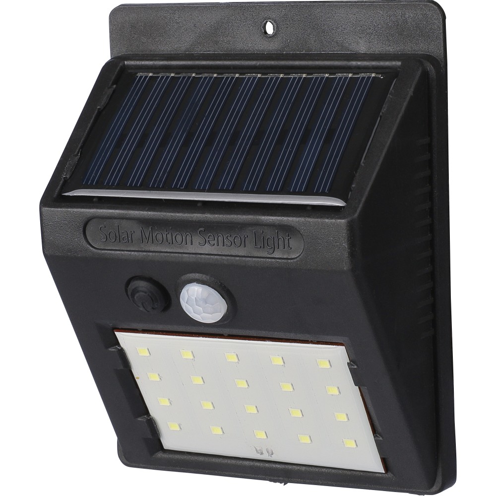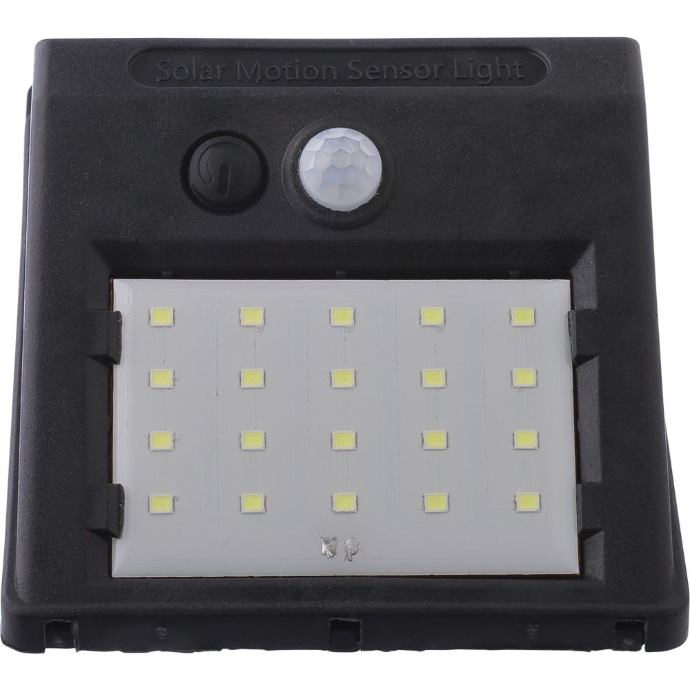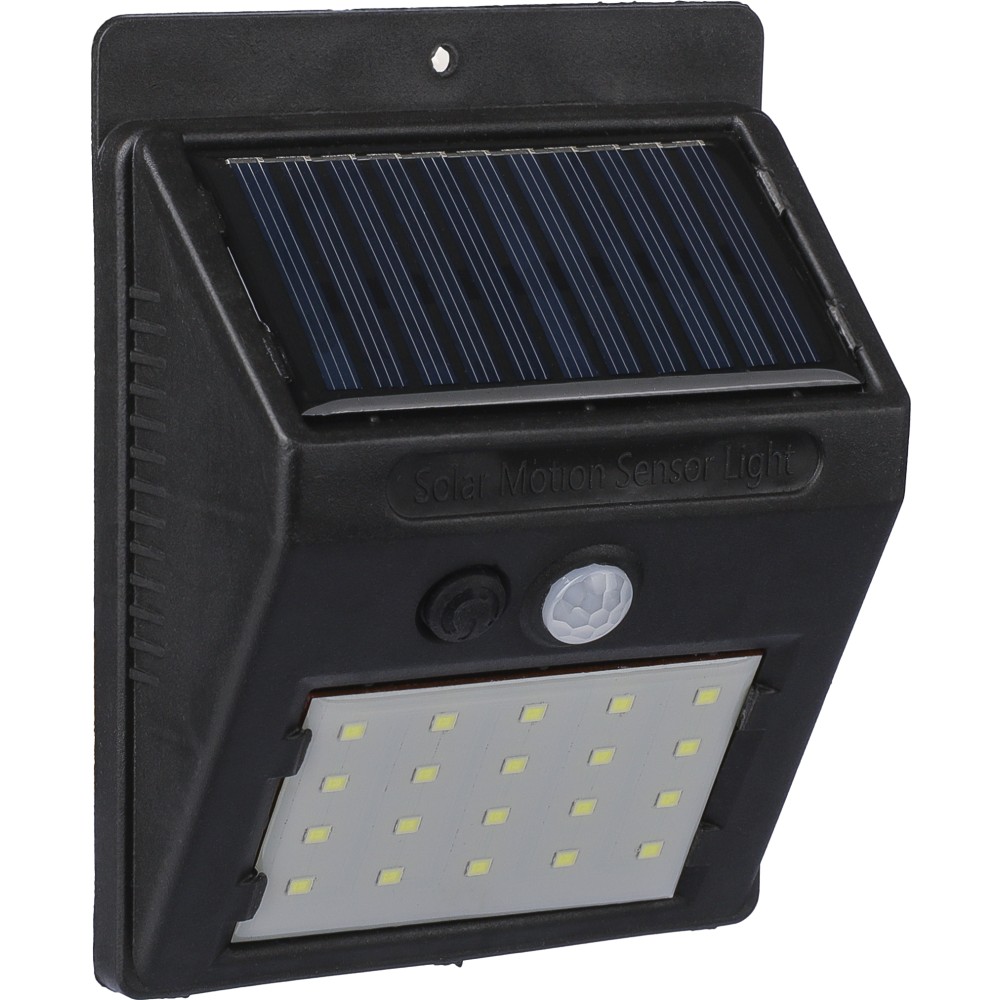 Napelemes lámpa 20 COB LED-del. Éjjeli érzékelővel (CDS) és mozgásérzékelővel (PIR). 800 mAh-s akkumulátorral, töltőkábellel, IP44 besorolással és állandó vagy villogó funkciókkal. Csomagolása barna papírdoboz. PP.