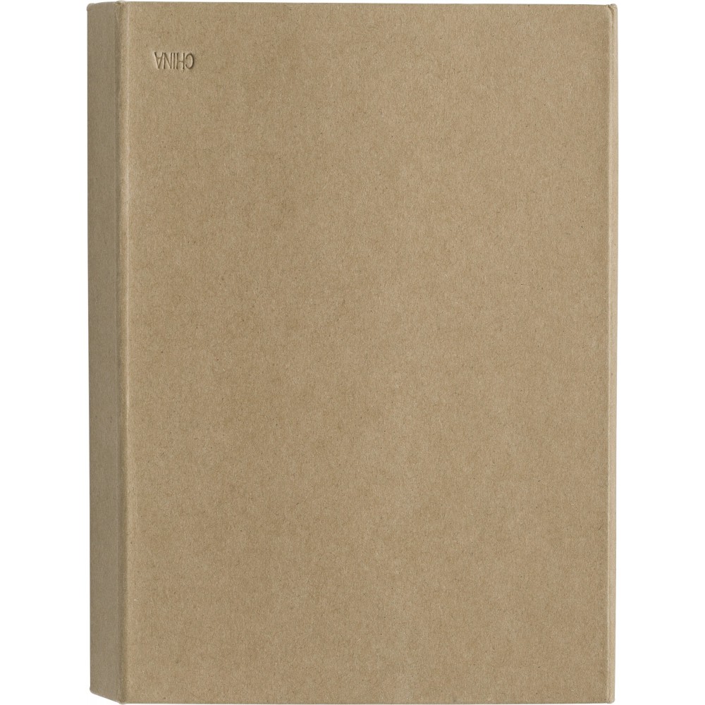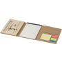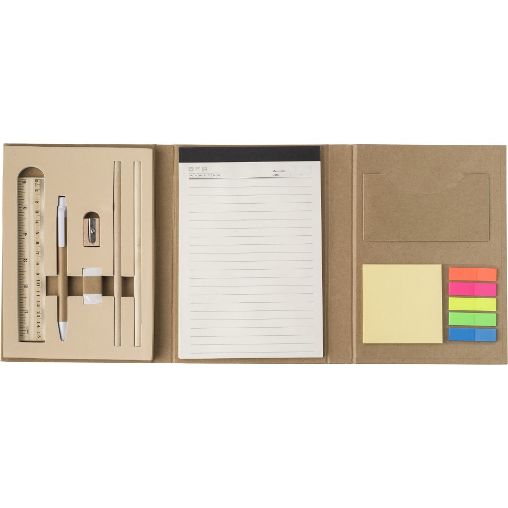 Irodaszermappa tartalma: negyven lapos jegyzetfüzet, bambusz vonalzó (15 cm), karton toll műanyag heggyel, klipsszel és nyomógombbal, kék tollbetéttel, valamint két ceruza, hegyező, radír, öntapadó jelölők (25 lap színenként ) és egy belső zseb. Fa, karton, gumi, EVA, papír.
