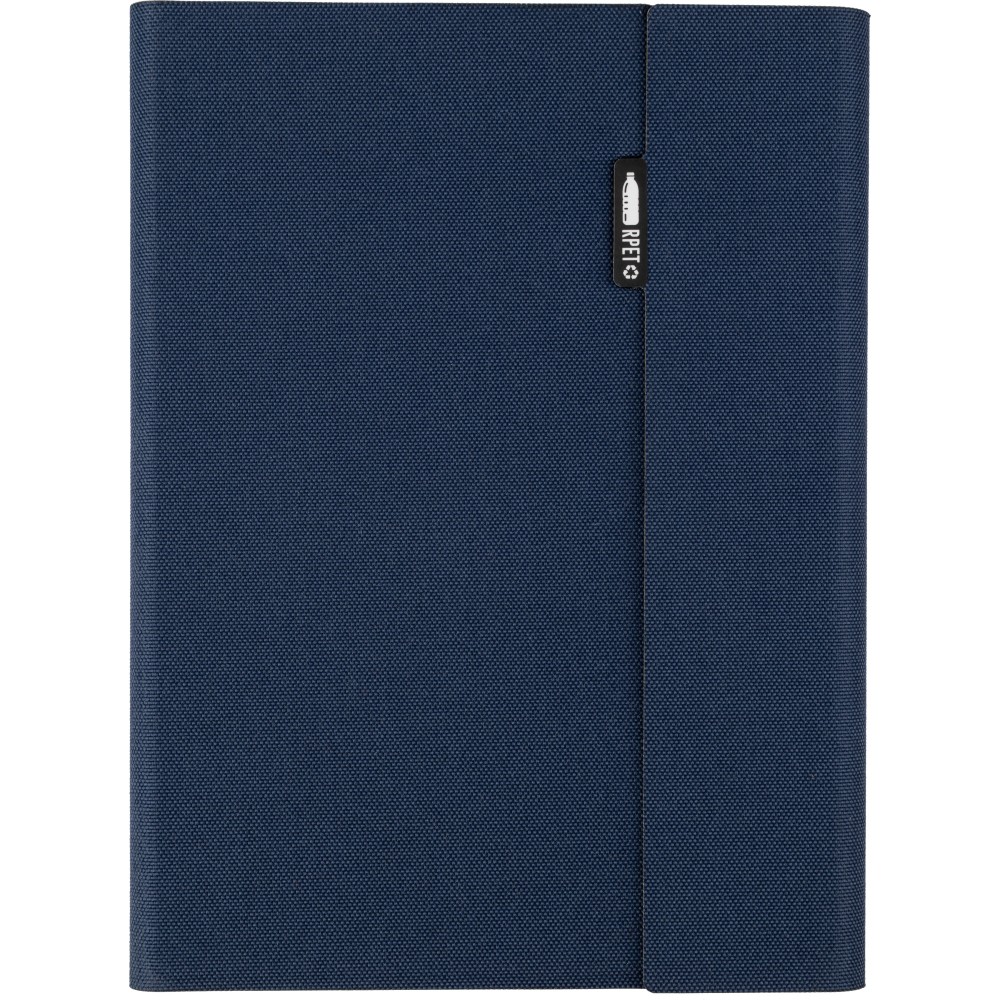 RPET mappa kb. A5-ös méretben, több rekesszel, telefontartóval és mágneses zárással. Tartalmazza a jegyzettömböt 64 vonalas lappal. Egyedileg csomagolva kraft papír tokba.
