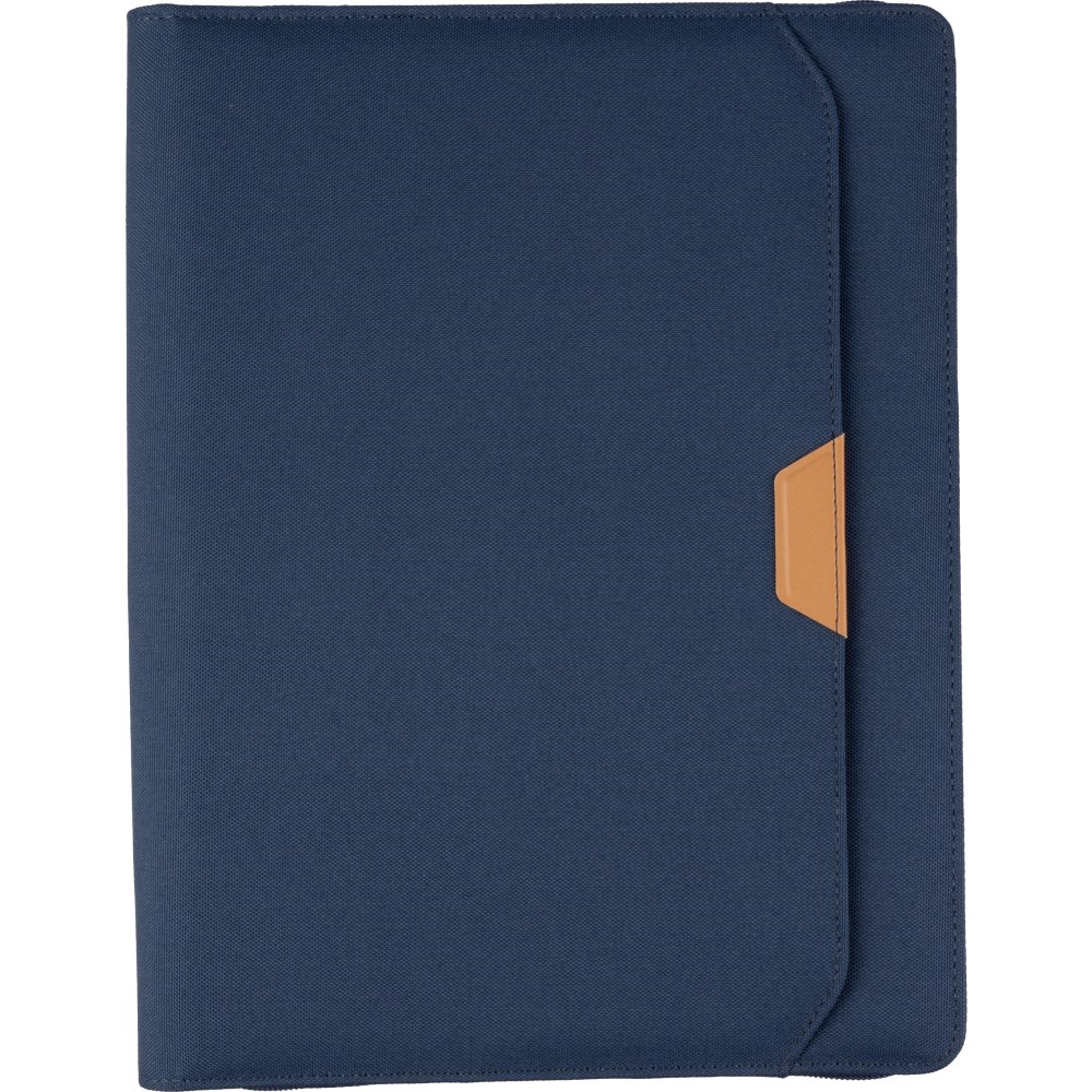 RPET mappa kb. A4-es méretben, cipzárral, több rekesszel és egy tollhurokkal. Tartalmaz egy jegyzettömböt 20 vonalas lappal. Kis zseb az elején. Egyedi csomagolás barna kraft dobozban.