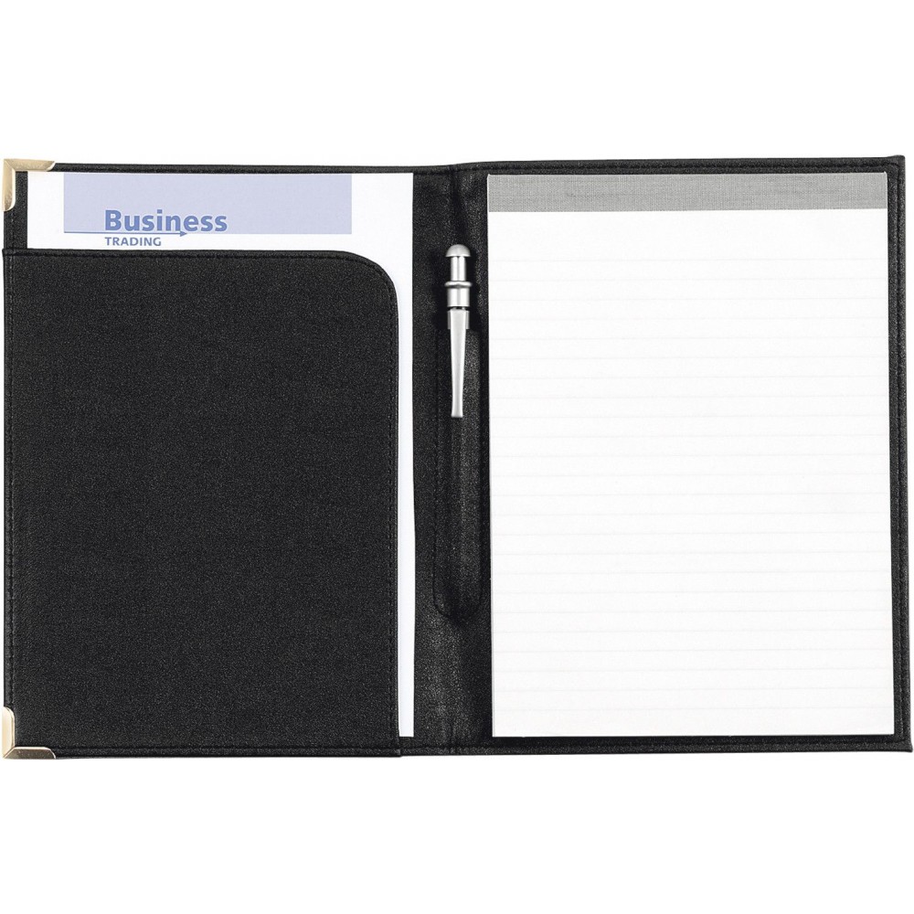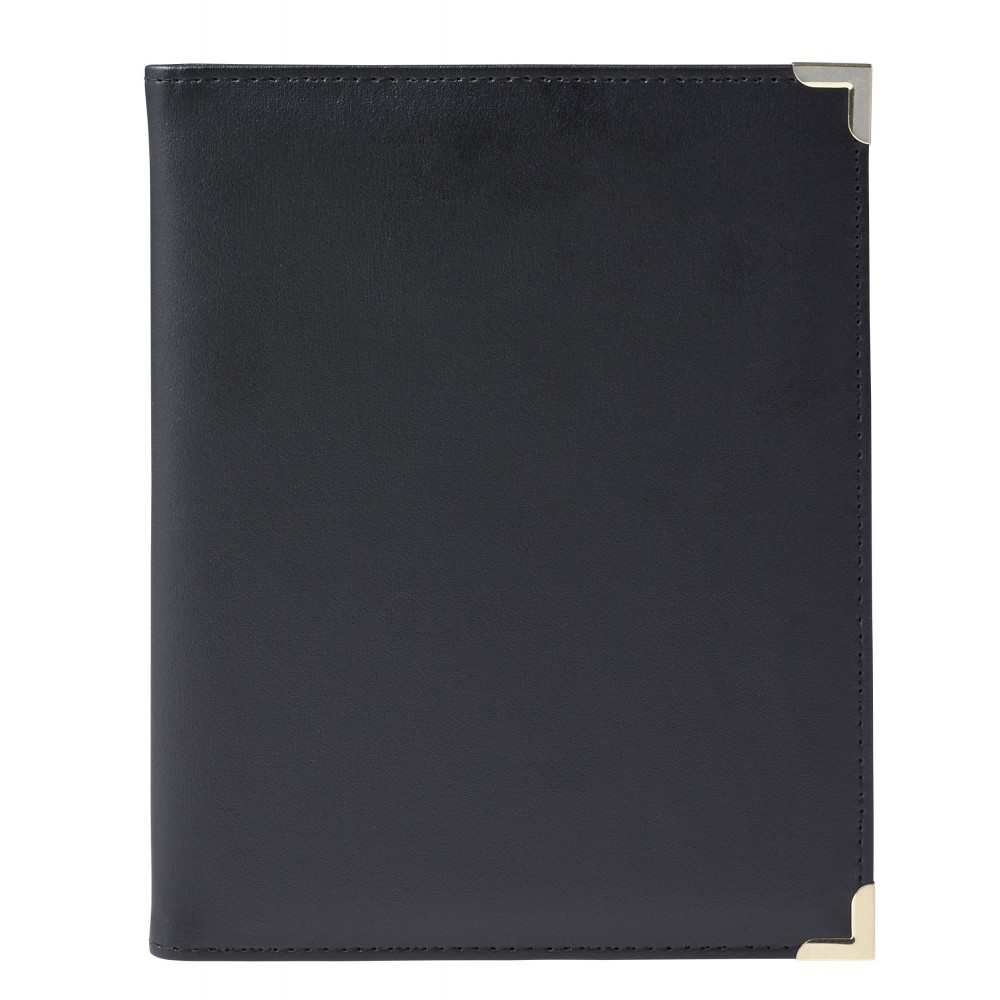 A5-ös PU mappa fém sarokkal. Jegyzettömböt nem tartalmaz. 30 vagy 50 lapos jegyzettömb fehér lapokkal a 23023 vagy 23026 cikkszámon külön rendelhető. A fekete mappa arany színű sarkokkal, a kék mappa ezüst színű sarkokkal érkezik.