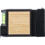 Mérőszalag bambusz részletekkel és beépített vízmértékkel. 3 méteres, 12 mm széles fém szalaggal. Tartalmaz 5 bitfejet, így csavarhúzóként is használható. MID tanúsítvánnyal rendelkezik. Egyenként barna kartondobozba csomagolva. Anyaga: ABS.