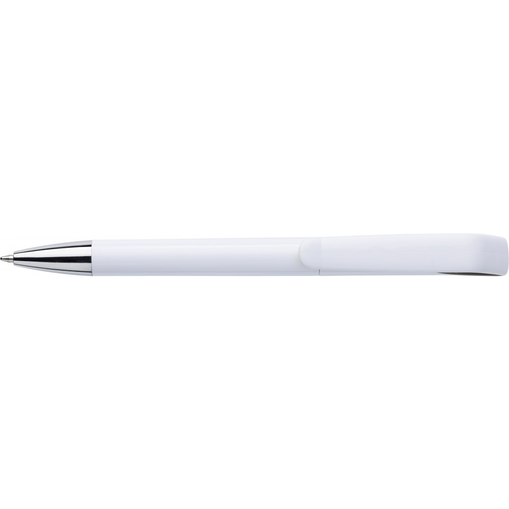 Geometrikus kiképzésű golyóstoll fényes ezüst kiegészítővel, csavaros mechanikával, kék tollbetéttel. Műanyag.