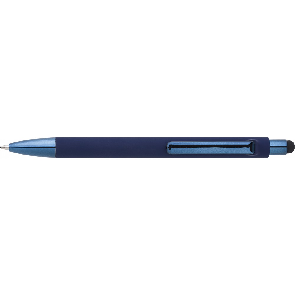 Golyóstoll gumis bevonattal és UV színű részletekkel, érintővel, kék tollbetéttel. ABS, PP műanyag, szilikon, vas.
