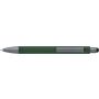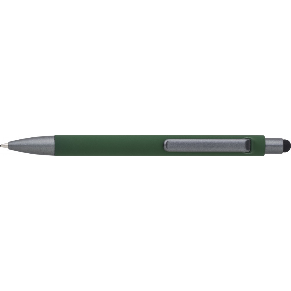 Golyóstoll gumis bevonattal, érintővel, kék tollbetéttel. ABS, PP műanyag, szilikon, vas.