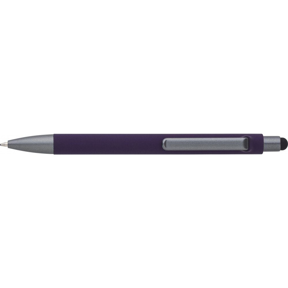 Golyóstoll gumis bevonattal, érintővel, kék tollbetéttel. ABS, PP műanyag, szilikon, vas.