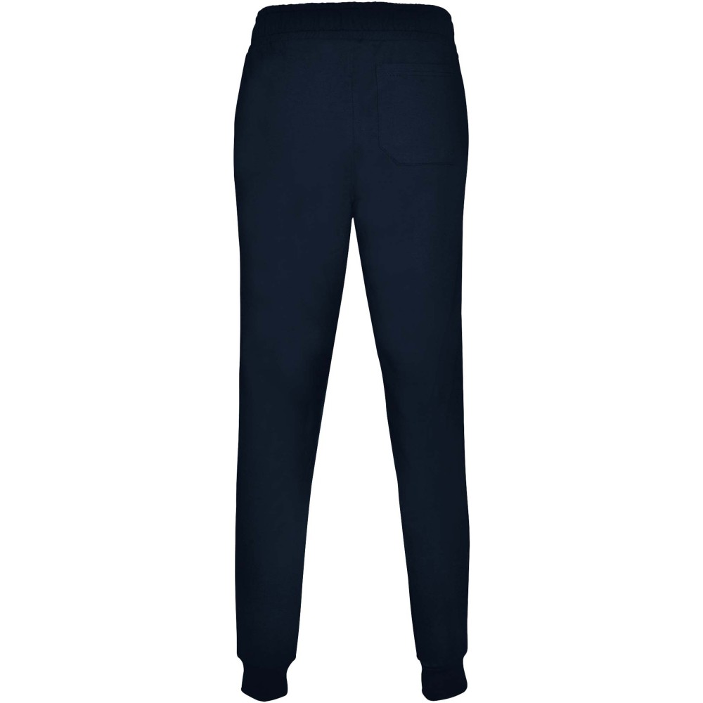 Sportnadrág széles, állítható derékkal és húzózsinórral, szűkített szegélyekkel a lábakon, megerősített varratokkal, bordás oldalsó zsebekkel és díszített varrássú hátsó zsebbel. Levehető címke.