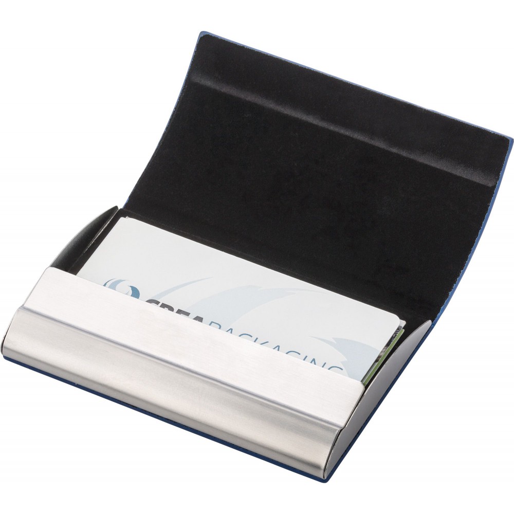 Ívelt, fekvő formátumú névjegy- és hitelkártya tartó PU bevonattal, mágneses záródással, belül bársony béléssel.