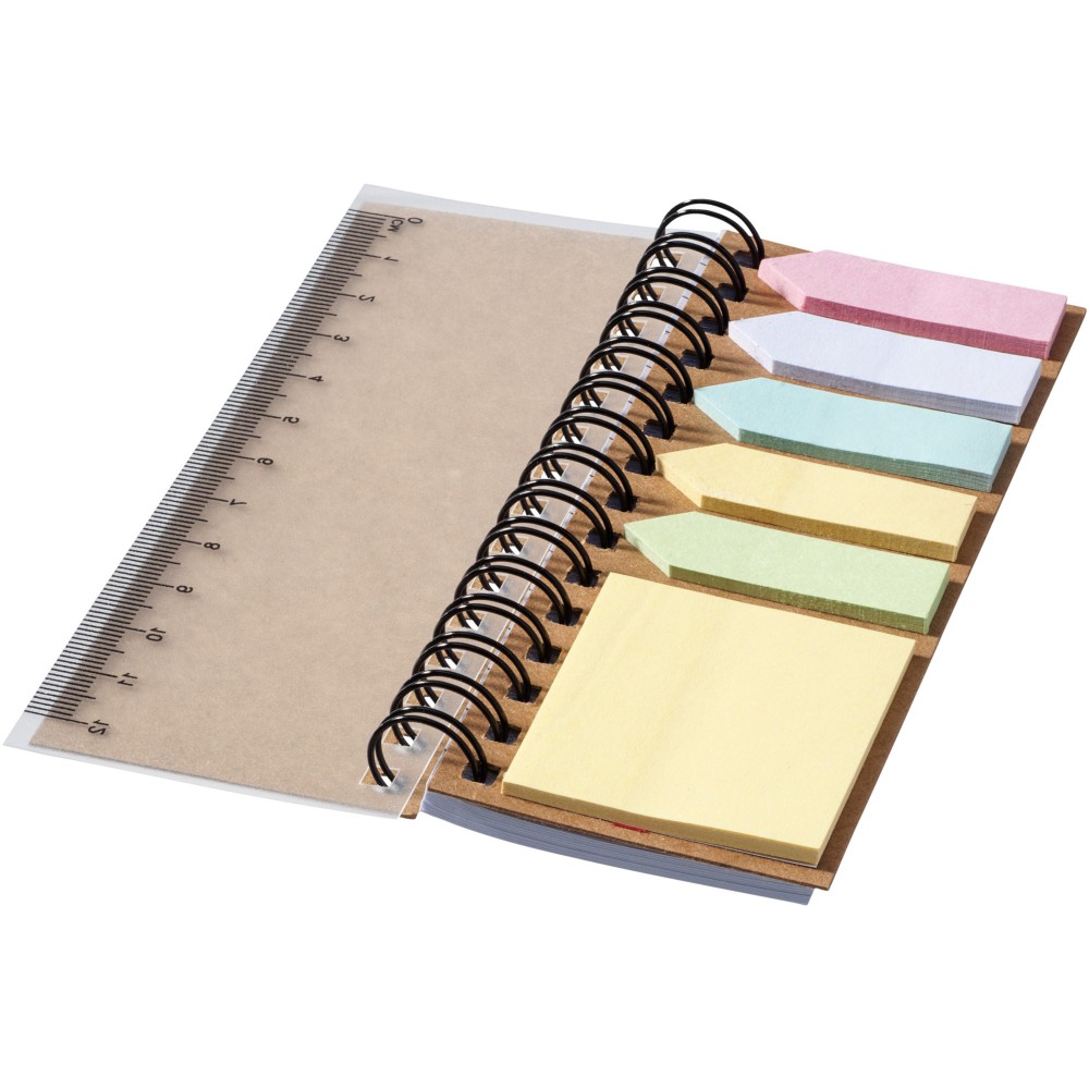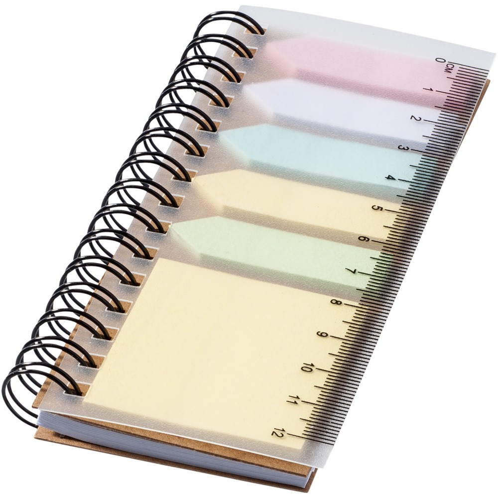 Notesz 25 öntapadó lappal 5-5 színben, egy 25 lapos blokk, 40 oldal fehér vonalas lap. Vonalzót tartalmaz az első borítón.