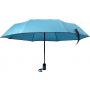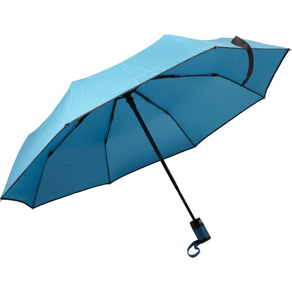 Összecsukható automata esernyő fém vázzal, üvegszálas bordákkal, műanyag fogóval, tokkal.