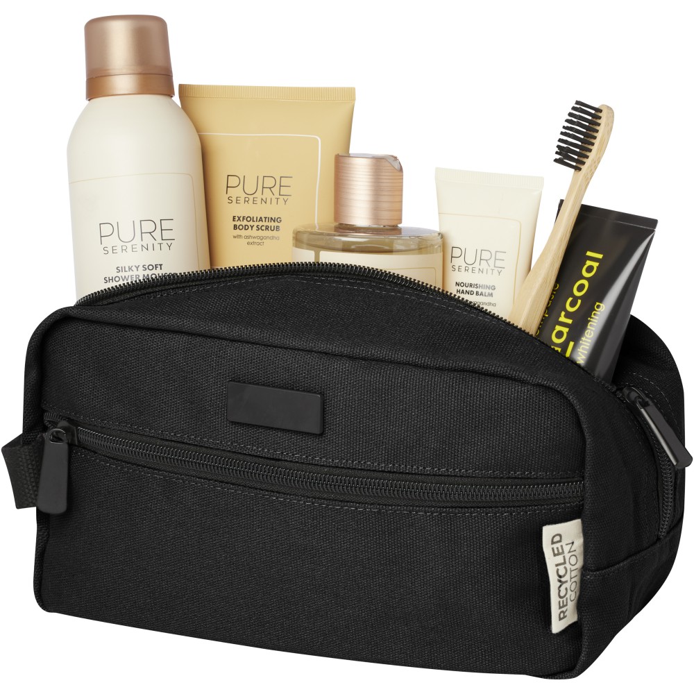 GRS tanúsítvánnyal rendelkező újrahasznosított vászonból és GRS tanúsítvánnyal rendelkező RPET béléssel készült piperetáska. Egy cipzáras elülső zsebbel és egy cipzáras főrekesszel, szervezőzsebekkel és pánttal rendelkezik. Fémlapja gravírozható. Űrtartalom: 3,5 liter.