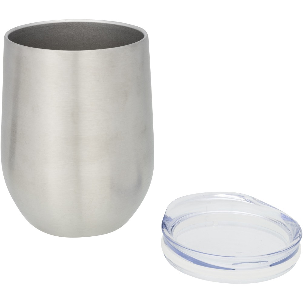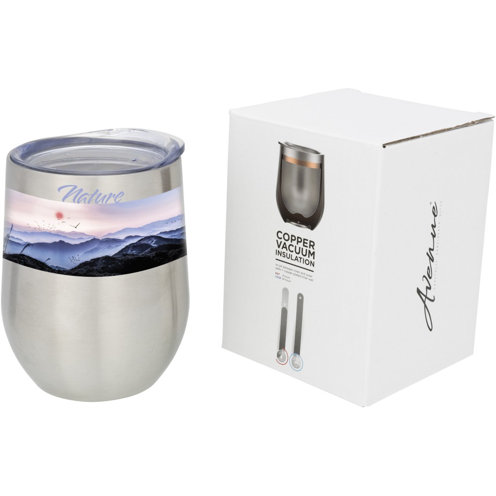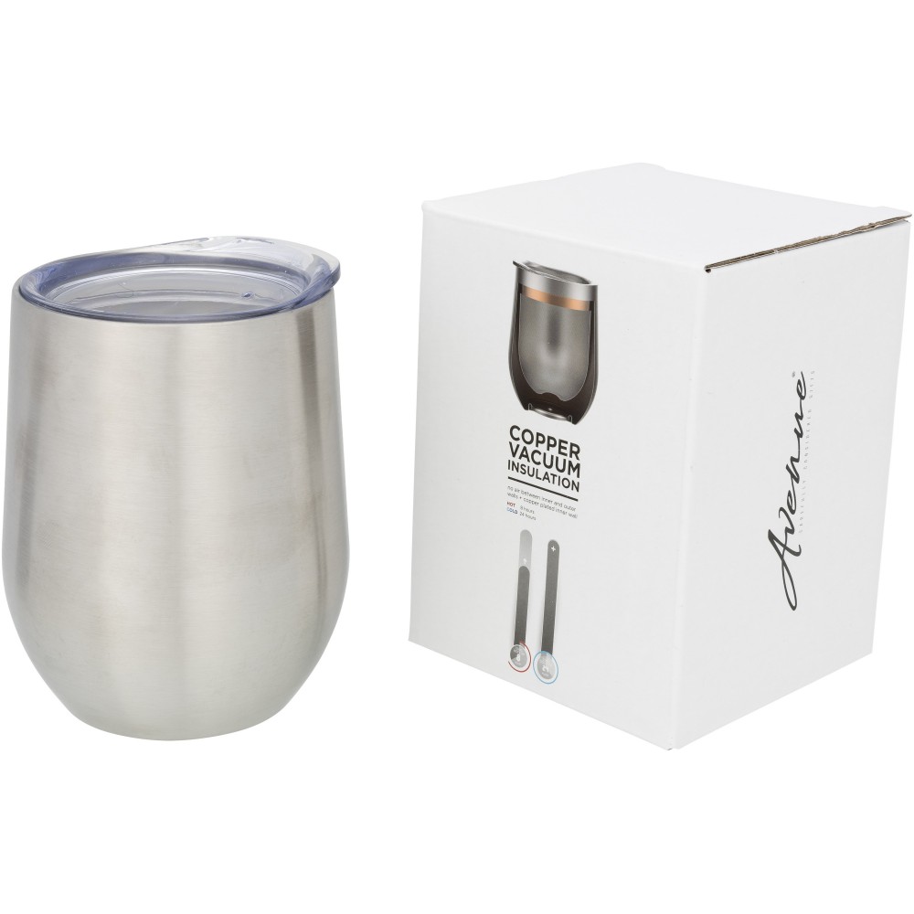 Rozsdamentes, rézbetétes szigetelésű, duplafalú vákumos pohár csavaros fedéllel. Kialakításának köszönhetően a páralecsapódás nem alakul ki. Hőtartóképesség 8 óra, hidegtartó képesség 24 óra. Nem szivárgásmentes. Szénsavas italokkal is használható. Mosogatógépben nem mosható és mikrohullámú sütőben történő melegítésre nem alkalmas. Űrtartalom: 350 ml. Csomagolása Avenue ajándékdoboz. Rozsdamentes acél.
