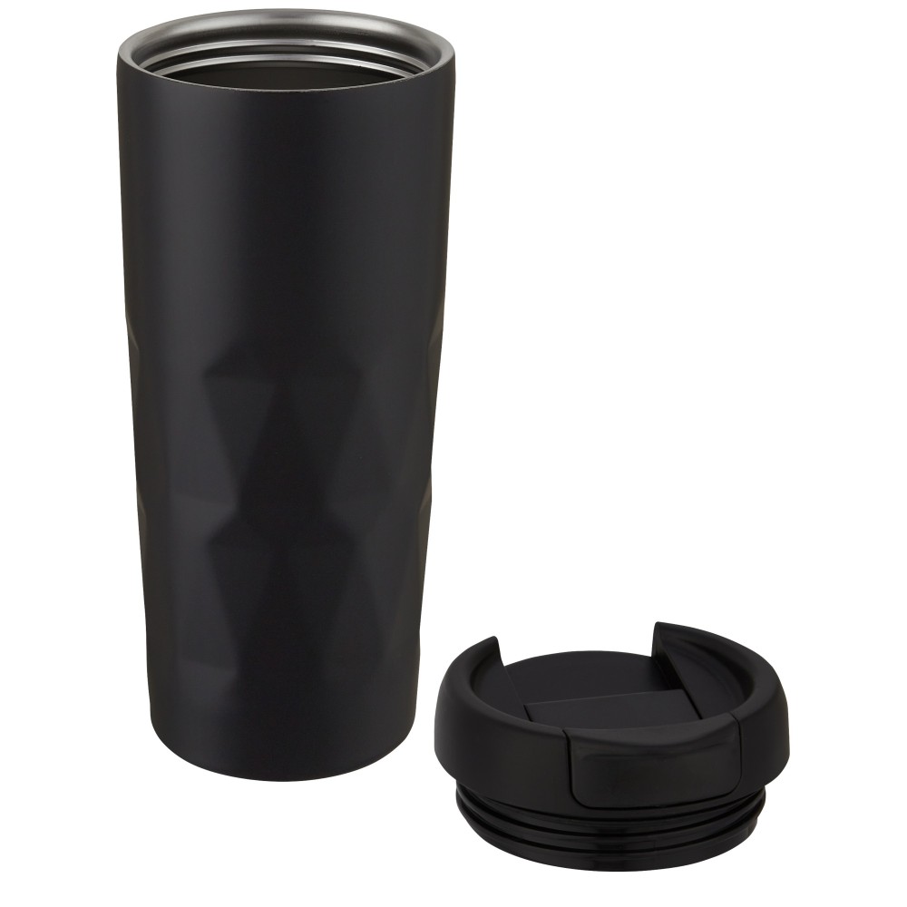 Duplafalú réz vákuumszigetelt pohár csavaros szivárgásmentes fedéllel, kifinomult geometriai kialakítással. A szigetelt 18/8-as rozsdamentes acél több órán keresztül melegen vagy hidegen tartja az italokat. BPA-mentes, a német élelmiszerbiztonsági törvény (LFGB) szerint tesztelt és jóváhagyott, és a REACH előírásai szerint ftaláttartalomra tesztelve. Űrtartalma 450 ml. Kézi mosogatása javasolt. Újrahasznosított karton díszdobozban.
