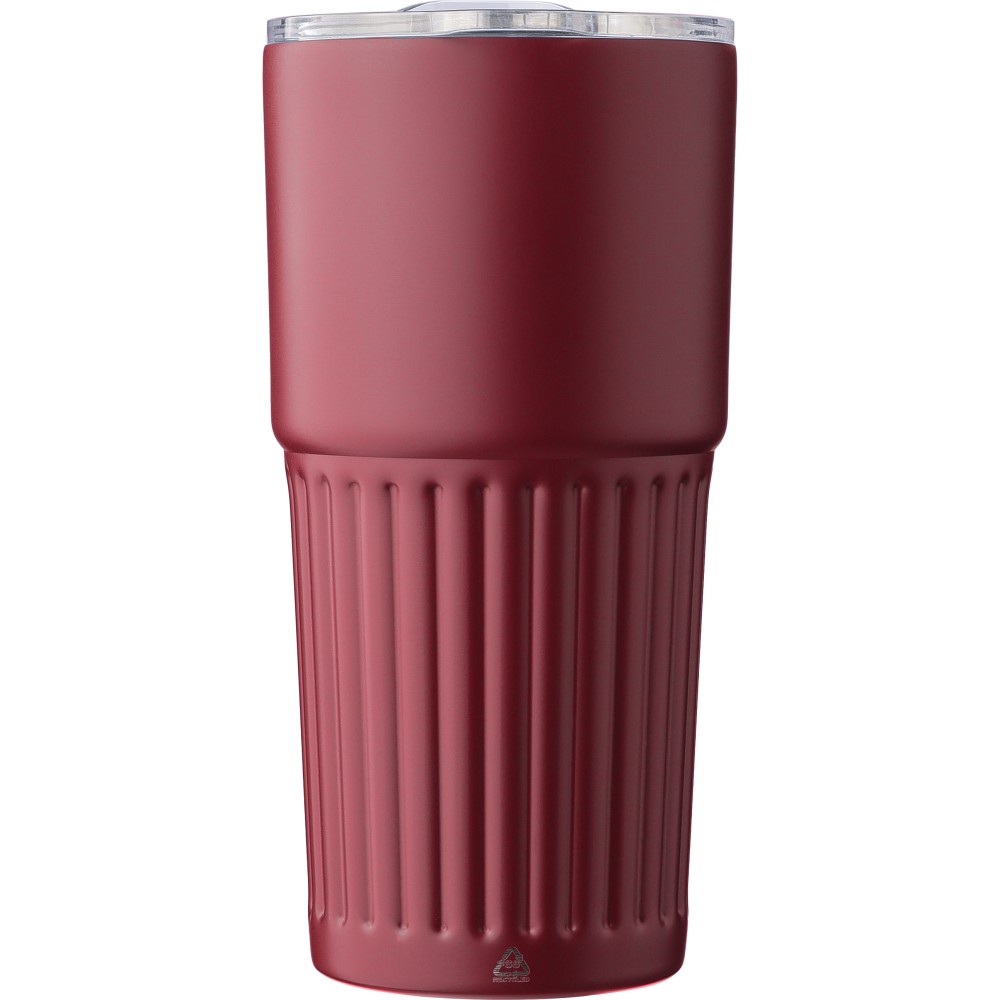 Újrahasznosított rozsdamentes acélból készült, duplafalú ivópohár (500 ml). Belső része 304-es, külső része 201-es rozsdamentes acél, bordázott fogófelülettel. AS fedéllel rendelkezik csúsztatható zárással. A palacktesten gravírozott recycled (újrahasznosított) alapanyagra utaló logó található. Darabonként barna kartondobozba csomagolva.