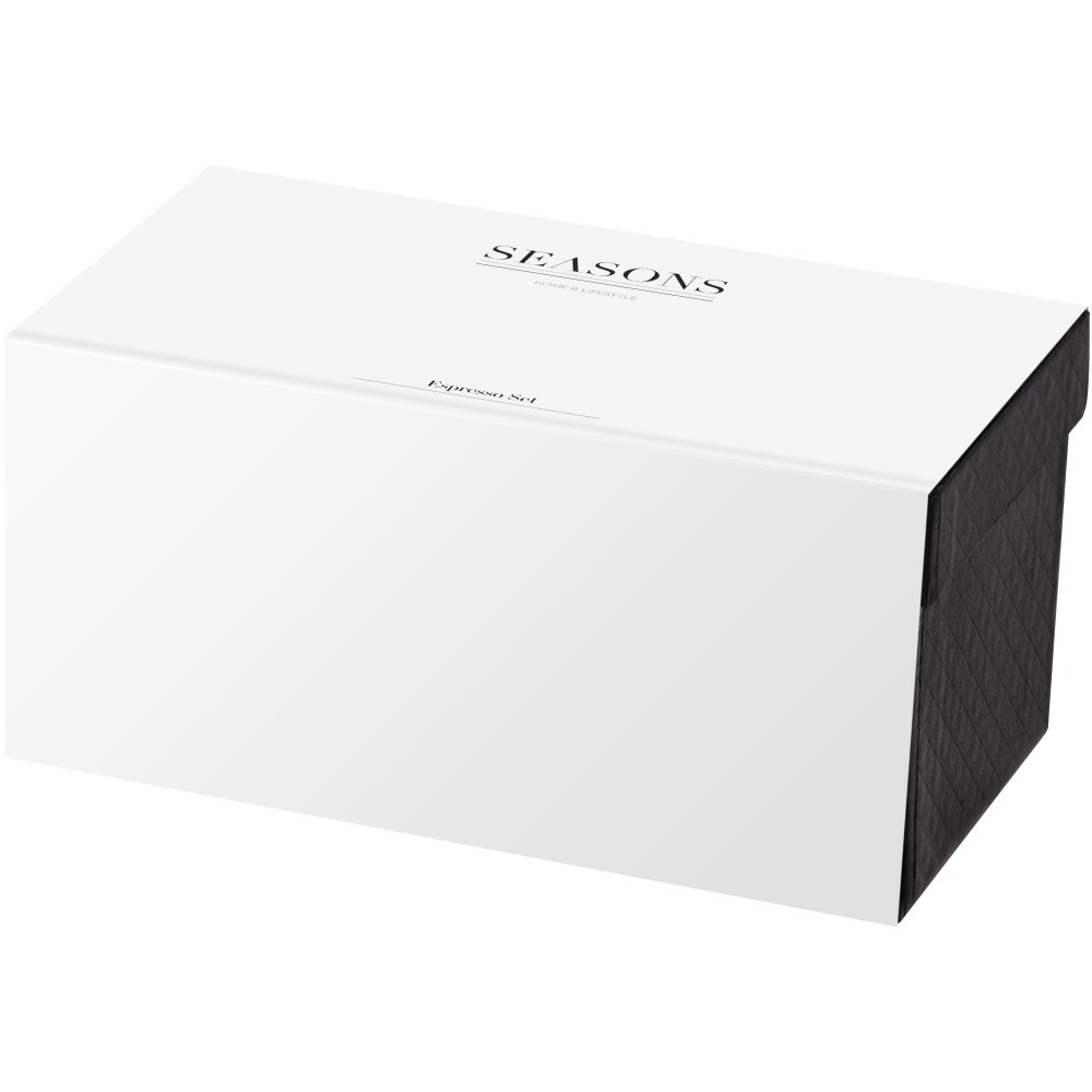 Duplafalú, hőszigetelt 80 ml-es eszpresszó csészék. A készletet luxus kivitelű ajándékdobozban kínáljuk. Logótábla tartozik hozzá. Mosogatógépben nem tisztítható.
